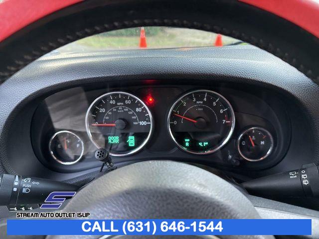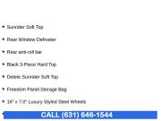 Connectivity Group, Quick Order Package 23B, Sunrider Soft Top, 8 Speakers, AM/FM radio, CD player, Radio: Uconnect 130 AM/FM/CD/MP3, SIRIUS Satellite Radio, Air Conditioning, Rear Window Defroster, Power steering, Steering wheel mounted audio controls, Tire Pressure Monitoring Display, Normal Duty Suspension, Traction control, 4-Wheel Disc Brakes, ABS brakes, Dual front impact airbags, Front anti-roll bar, Integrated roll-over protection, Low tire pressure warning, Occupant sensing airbag, Rear anti-roll bar, Brake assist, Electronic Stability Control, Front fog lights, Speed control, Black 3-Piece Hard Top, Delete Sunrider Soft Top, Compass, Driver door bin, Driver vanity mirror, Manufacturer's Statement of Origin, Outside temperature display, Passenger vanity mirror, Tachometer, Tilt steering wheel, Trip computer, Uconnect Voice Command w/Bluetooth, Vehicle Information Center, Cloth Bucket Seats, Front Bucket Seats, Freedom Panel Storage Bag, Front Center Armrest w/Storage, Passenger door bin, 16" x 7.0" Luxury Styled Steel Wheels, Tinted Rear Quarter & Liftgate Windows, Rear Window Wiper/Washer, Variably intermittent wipers, 3.21 Rear Axle Ratio
