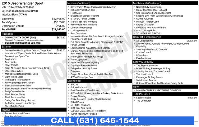 Clean CARFAX. 2015 Jeep Wrangler Black Clearcoat 16" x 7.0" Luxury Styled Steel Wheels, Black 3-Piece Hard Top, Delete Sunrider Soft Top, Freedom Panel Storage Bag, Rear anti-roll bar, Rear Window Defroster, Rear Window Wiper/Washer, Sunrider Soft Top, Tinted Rear Quarter & Liftgate Windows. Priced below KBB Fair Purchase Price!