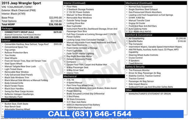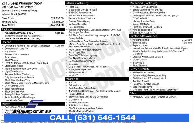 For more information on this 2015 Jeep Wrangler, please call Stream Auto Outlet Islip at (631) 646-1544 or with the contact form on this page. This vehicle's vin number is 1C4AJWAG4FL724961 and is recorded as being in stock at Stream Auto Outlet Islip at 2232 Sunrise Hwy in Islip. See all cars from this dealership.