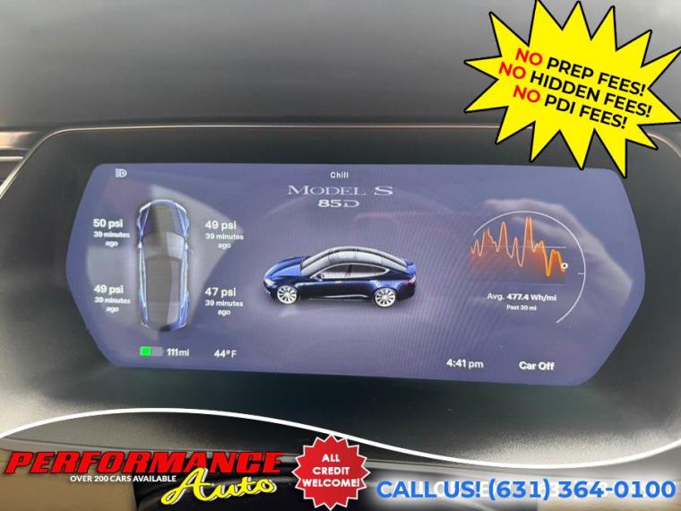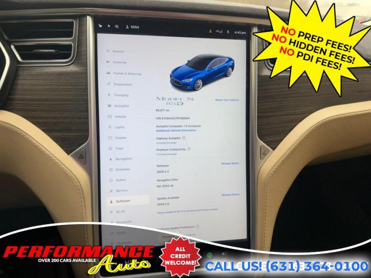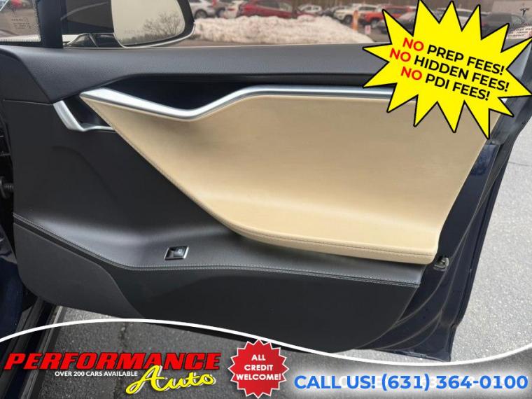100% Clean Carfax! 2015 Tesla Model S85D! All Wheel Drive! This vehicle is on consignment, the existing owner has enjoyed Free Supercharging for life and retains the right to sell the car with those options on their own if the dealership does not take a deposit on it..... Please call us with any questions regarding features on this vehicle... Premium Connectivity and Highway Autopilot included. REMEMBER THE PERFORMANCE AUTO DIFFERENCE - NO PREP FEES! NO HIDDEN FEES! With apologies to all our customers, past and future: All of our competitors advertise cars using price structures that get their cars seen online, while no one sees ours. And so, after 25 years of business, we have to experiment with THEIR system. Therefore our advertised prices on third-party advertisers reflect a $2500 down payment or equivalent trade. It is NOT a HIDDEN FEE: we are completely up front and honest about why we have to try it. Our website clearly states the pricing on every vehicle. Third Party advertisers like Carfax, Cargurus and Autotrader etc. reward this price structure with better placement and badges. We have been asking third party advertisers for many years to give us a level playing field. We always succeed on a level playing field. Our competitors have downpayments between $2500-$9000 or even a % of price, then add hidden fees or require financing through them. Some dealers will not list a downpayment in their ads and you only find out when you go to see the vehicle. With us, financing is not required, but if you prefer to, we work with many banks to get you the best terms. We are sorry for any inconvenience, but pure pricing placed our vehicles at the bottom of search lists. We had no choice but to try advertising their way so that you can at least see our inventory, and hopefully we will do business. We have been selling quality cars with great reviews for 25 years. Our reputation is our strongest quality. We will do everything we can to satisfy you. It is no accident that 30% of our customers are repeat business.