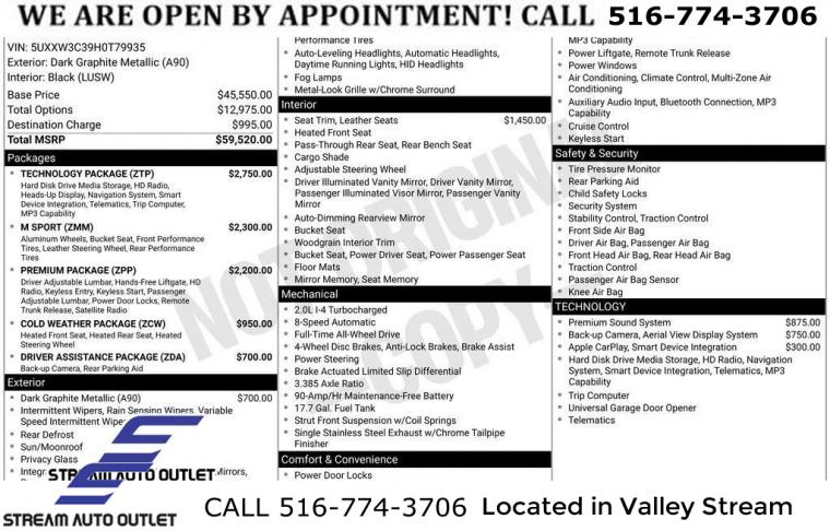 3.385 Axle Ratio, Wheels: 18" x 8.0" Double Spoke (Style 605), Wheels: 19" x 8.5" M Double Spoke (Style 622M), Power Front Bucket Seats, Sport Seats, Heated Front Seats, SensaTec Leatherette Upholstery, Anti-Theft AM/FM Stereo CD/MP3 Player, Rear-View Camera, Fineline Anthracite Wood Trim, Surround View, Navigation System, harman/kardon Surround Sound System, Apple CarPlay Compatibility, Standard Suspension, Heated Steering Wheel, Comfort Access Keyless Entry, Without Lines Designation Outside, Lumbar Support, Heated Rear Seats, Retractable Headlight Washers, Park Distance Control, Head-Up Display, HD Radio, SiriusXM Satellite Radio, Hi-Fi Sound System, BMW Online & BMW Apps, Advanced Real-Time Traffic Information, Remote Services, Enhanced USB & Bluetooth, M Steering Wheel, Aerodynamic Kit, Shadowline Exterior Trim, Anthracite Headliner, Increased Top Speed Limiter, BMW Connected App Compatibility, Instrument Cluster w/Extended Contents, 4-Wheel Disc Brakes, Emergency communication system: BMW Assist eCall, High intensity discharge headlights: Bi-xenon, Speed-Sensitive Wipers, Auto-dimming Rear-View mirror, Front beverage holders, Variably intermittent wipers, Turn signal indicator mirrors, Trip computer, Traction control, Tilt steering wheel, Telescoping steering wheel, Steering wheel mounted audio controls, Sport steering wheel, Split folding rear seat, Speed-sensing steering, Speed control, Security system, Remote keyless entry, Rear window defroster, Rear seat center armrest, Rear reading lights, Rear fog lights, Rear anti-roll bar, Rain sensing wipers, Radio data system, Power windows, Power steering, Power passenger seat, Power moonroof, Power driver seat, Power door mirrors, Passenger vanity mirror, Passenger door bin, Panic alarm, Overhead airbag, Outside temperature display, Occupant sensing airbag, Memory seat, Low tire pressure warning, Leather steering wheel, Illuminated entry, Genuine wood console insert, Garage door transmitter, Fully automatic headlights, Front reading lights, Front fog lights, Front dual zone A/C, Front anti-roll bar, Four wheel independent suspension, Dual front side impact airbags, Dual front impact airbags, Driver vanity mirror, Driver door bin, Delay-off headlights, CD player, Bumpers: body-color, Brake assist, Bodyside moldings, Automatic temperature control, Auto-dimming door mirrors, Anti-whiplash front head restraints, Alloy wheels, AM/FM radio, ABS brakes, Tachometer, Rear Parking Sensors, Power Liftgate, Front Center Armrest, Front Bucket Seats, Electronic Stability Control, Air Conditioning, 9 Speakers