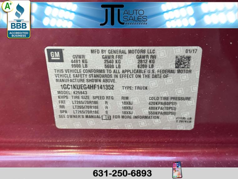 For more information on this 2017 Chevrolet Silverado, please call JTL Auto Sales at (631) 250-6893 or with the contact form on this page. This vehicle's vin number is 1GC1KUEG4HF141352 and is recorded as being in stock at JTL Auto Sales at 504 Middle Country Rd in Selden. See all cars from this dealership.