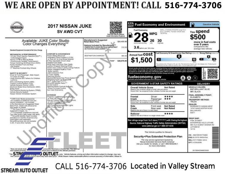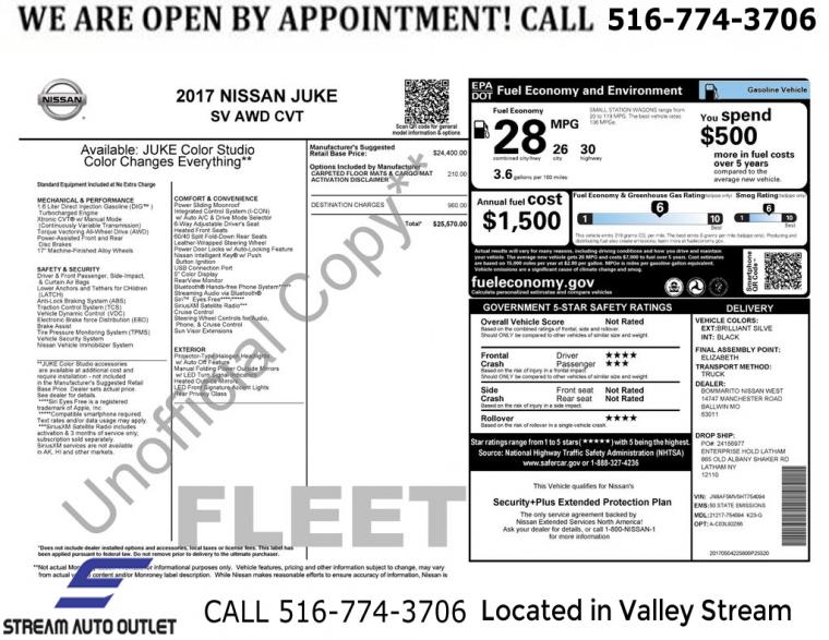 For more information on this 2017 Nissan Juke, please call Stream Auto Outlet Valley Stream at (516) 774-3706 or with the contact form on this page. This vehicle's vin number is JN8AF5MV5HT754094 and is recorded as being in stock at Stream Auto Outlet Valley Stream at 324 W Merrick Rd in Valley Stream. See all cars from this dealership.