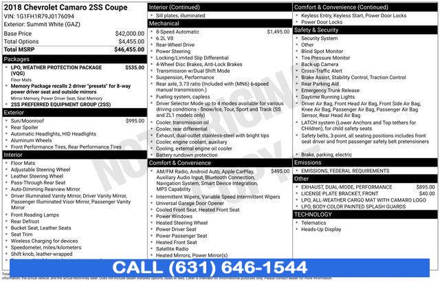 2018 Chevrolet Camaro Summit White Apple CarPlay/Android Auto, Bose Premium 9-Speaker Audio System Feature, Front License Plate Bracket, Heated door mirrors, Heated front seats, Heated steering wheel, Paddle-Shift Manual Controls, Power Sunroof, Preferred Equipment Group 2SS, Radio: Chevrolet MyLink w/Navigation, SiriusXM Satellite Radio. Odometer is 35496 miles below market average! 17/27 City/Highway MPG