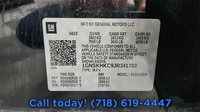 Enhanced Driver Alert Package, License Plate Front Mounting Package, Preferred Equipment Group 1LT, Premium Smooth Ride Suspension Package, 9 Speakers, AM/FM radio: SiriusXM, Bose Premium Audio System Feature, CD player, Floor Console w/Storage Area, HD Radio, Radio: Chevrolet MyLink AM/FM Stereo, Radio: Chevrolet MyLink AM/FM Stereo w/Navigation, Single-Slot CD/MP3 Player, SiriusXM Satellite Radio, Air Conditioning, Automatic temperature control, Front dual zone A/C, Rear air conditioning, Rear window defroster, 12-Volt Auxiliary Power Outlet (5), 6-Way Power Front Passenger Seat Adjuster, Memory seat, Memory Settings, Pedal memory, Power driver seat, Power steering, Power windows, Power-Adjustable Accelerator & Brake Pedals, Remote keyless entry, Steering wheel mounted audio controls, Universal Home Remote, Speed-sensing steering, Traction control, 4-Wheel Antilock Disc Brakes, 4-Wheel Disc Brakes, ABS brakes, Dual front impact airbags, Dual front side impact airbags, Emergency communication system: OnStar Guidance, Front anti-roll bar, Front wheel independent suspension, Low tire pressure warning, Occupant sensing airbag, Overhead airbag, Rear anti-roll bar, Remote Vehicle Start, Power Liftgate, Brake assist, Electronic Stability Control, Exterior Parking Camera Rear, Auto High-beam Headlights, Delay-off headlights, Fully automatic headlights, Driver Inboard & Front Passenger Airbags, Extended-Range Remote Keyless Entry, Panic alarm, Security system, Electronic Cruise Control w/Set & Resume Speed, Speed control, Black Assist Steps, Bumpers: body-color, Heated door mirrors, Intellibeam Headlamps w/Automatic High Beam On/Off, Power door mirrors, Roof rack: rails only, Spoiler, 1st & 2nd Row Color-Keyed Carpeted Floor Mats, Adjustable pedals, Apple CarPlay/Android Auto, Auto-Dimming Inside Rear-View Mirror, Auto-dimming Rear-View mirror, Color-Keyed Carpeting Floor Covering, Compass, Driver door bin, Driver vanity mirror, Forward Collision Alert, Front reading lights, Garage door transmitter, Illuminated entry, Lane Keep Assist w/Lane Departure Warning, Leather-Wrapped Steering Wheel, Low Speed Forward Automatic Braking, OnStar Basic Plan For 5 Years, Outside temperature display, Overhead console, Passenger vanity mirror, Rear Park Assist w/Audible Warning, Rear reading lights, Rear seat center armrest, Safety Alert Seat, SiriusXM NavTraffic, Tachometer, Telescoping steering wheel, Tilt steering wheel, Trip computer, Voltmeter, 2nd Row 60/40 Split-Folding Manual Bench, 3rd Row Manual 60/40 Split-Folding Fold Flat Bench, 3rd row seats: split-bench, Front Bucket Seats, Front Center Armrest, Heated Front Reclining Bucket Seats, Heated front seats, Leather-Appointed Seat Trim, Power passenger seat, Split folding rear seat, Passenger door bin, Roof-Mounted Luggage Rack Side Rails, 18" x 8.5" High-Polished Aluminum Finish Wheels, Alloy wheels, Rain sensing wipers, Rear window wiper, Variably intermittent wipers, 3.08 Rear Axle Ratio