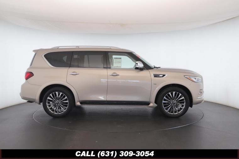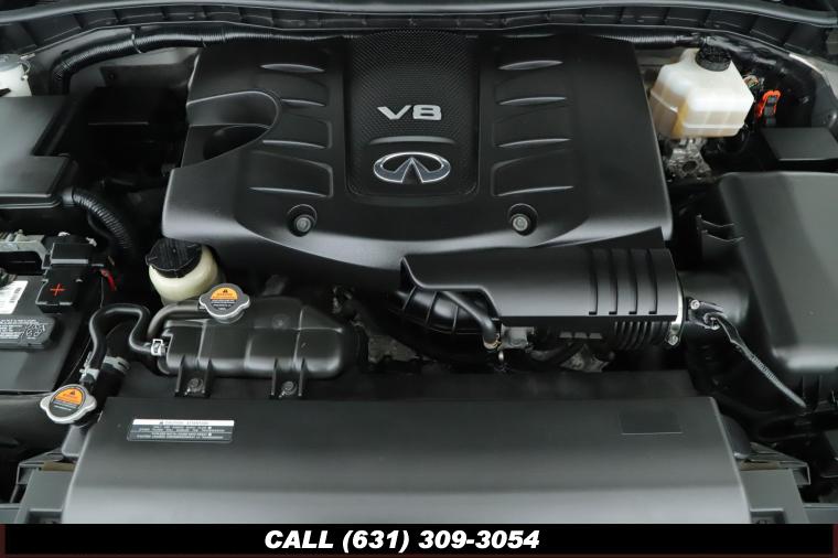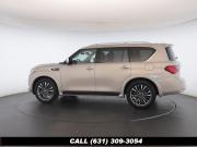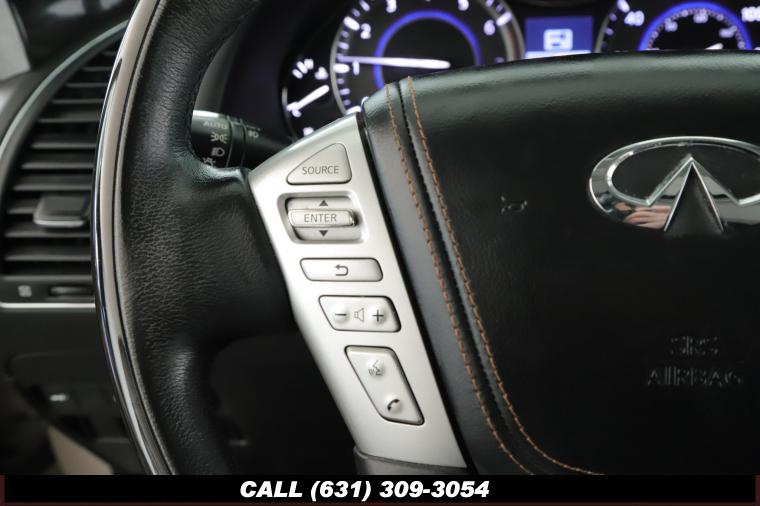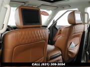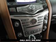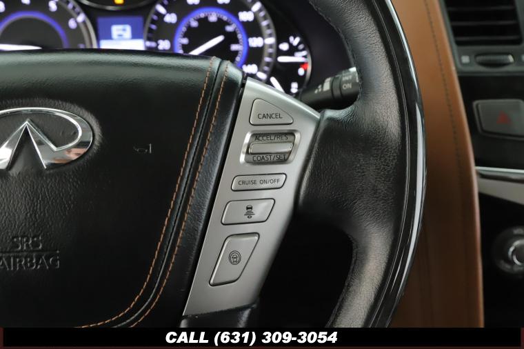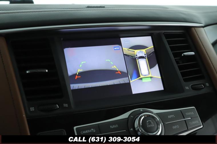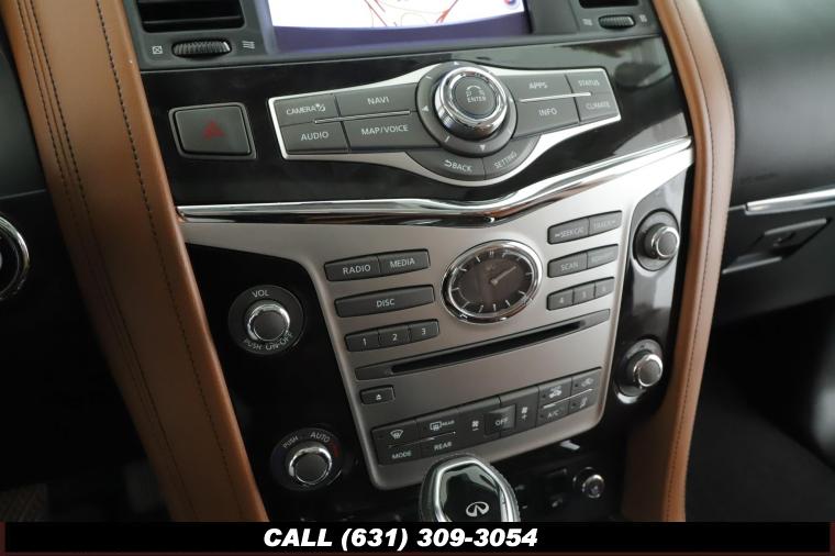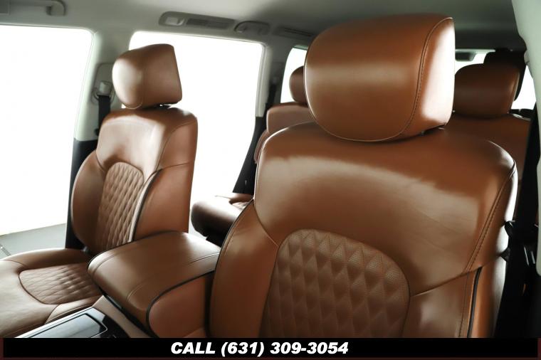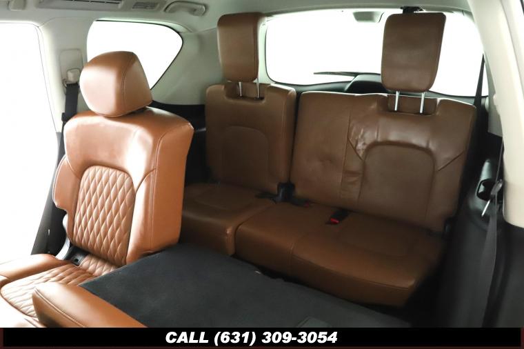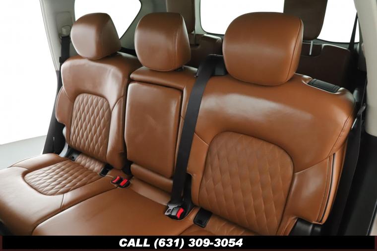 120V Power Outlet, 13 Speakers, 2.94 Axle Ratio, 22 Wheel Package, 3rd row seats: split-bench, 4-Wheel Disc Brakes, ABS brakes, Adaptive Front Lighting System, Advanced Climate Control System, Air Conditioning, Alloy wheels, AM/FM radio: SiriusXM, Anti-whiplash front head restraints, Auto High-beam Headlights, Auto tilt-away steering wheel, Auto-dimming door mirrors, Auto-dimming Rear-View mirror, Auto-leveling suspension, Automatic temperature control, Backup Collision Intervention (BCI), Blind Spot Intervention (BSI), Blind Spot Warning, Bose Cabin Surround Sound System, Brake Assist, Bumpers: body-color, CD Player, Charcoal/Espresso Burl Trim, Chrome Outside Mirror Caps, Climate-Controlled Front Seats, Delay-off headlights, Driver door bin, Driver Vanity Mirror, Dual 8 Color Monitors, Dual front impact airbags, Dual front side impact airbags, DVD-Audio, Electronic Stability Control, Emergency communication system: INFINITI Connection, Four wheel independent suspension, Front anti-roll bar, Front beverage holders, Front Bucket Seats, Front Center Armrest, Front dual zone A/C, Front fog lights, Front Pre-Crash Seatbelts, Front reading lights, Fully automatic headlights, Garage door transmitter: HomeLink, Genuine wood console insert, Genuine wood dashboard insert, Genuine wood door panel insert, Headlight Washers, Heated 2nd-Row Seats, Heated door mirrors, Heated Front Bucket Seats, Heated front seats, Heated Steering Wheel, Hydraulic Body Motion Control System, Illuminated entry, Intelligent Cruise Control (Full-Speed Range), Lane Departure Warning System, Leather Shift Knob, Leather Steering Wheel, Leather-Appointed Seats w/Stratford Burl Trim, Literature Kit, Low tire pressure warning, Memory seat, Navigation system: INFINITI InTouch Navigation, Occupant sensing airbag, Outside temperature display, Overhead airbag, Overhead console, Panic alarm, Passenger door bin, Passenger Vanity Mirror, Power door mirrors, Power Driver Seat, Power Liftgate, Power moonroof, Power Passenger Seat, Power Steering, Power Windows, ProACTIVE Package, ProASSIST Package, Radiant Illuminated Kick Plates, Radio data system, Radio: AM/FM/HD w/Single In-Dash CD/DVD Player & MP3, Rain Sensing Wipers, Rear air conditioning, Rear anti-roll bar, Rear audio controls, Rear reading lights, Rear seat center armrest, Rear window defroster, Rear window wiper, Reclining 3rd row seat, Remote keyless entry, Roof rack: rails only, Security System, Semi-Aniline Leather-Appointed Seating w/Quilting, Sensory Package, Smart Rear View Mirror, Speed control, Speed-sensing steering, Split Bench Seat Package, Split folding rear seat, Spoiler, Steering wheel memory, Steering wheel mounted audio controls, Tachometer, Telescoping steering wheel, Theater Package, Tilt steering wheel, Traction Control, Trip Computer, Turn signal indicator mirrors, Variably intermittent wipers, Vehicle Speed-Sensitive Power Steering, Voltmeter, Wheels: 20 x 8.0 Aluminum-Alloy, Wheels: 22 x 8.0 14-Spoke Forged Aluminum-Alloy, Wireless Headphones (2)