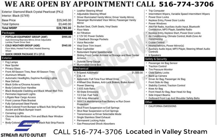 Cold Weather Group, Popular Equipment Group, Quick Order Package 27J (DISC), 6 Speakers, AM/FM radio: SiriusXM, Radio: Uconnect 4 w/7" Display, Air Conditioning, Automatic temperature control, Front dual zone A/C, Rear window defroster, Power steering, Power windows, Remote keyless entry, Steering wheel mounted audio controls, Four wheel independent suspension, Traction control, 4-Wheel Disc Brakes, ABS brakes, Anti-whiplash front head restraints, Dual front impact airbags, Dual front side impact airbags, Front anti-roll bar, Knee airbag, Low tire pressure warning, Occupant sensing airbag, Overhead airbag, Rear anti-roll bar, Brake assist, Electronic Stability Control, ParkView Rear Back-Up Camera, Delay-off headlights, Front fog lights, Fully automatic headlights, Panic alarm, Speed control, Bumpers: body-color, Heated door mirrors, Power door mirrors, Roof rack: rails only, Spoiler, All-Season Floor Mats, Auto-Dimming Rear-View Mirror, Cluster 7.0" Color Driver Info Display, Compass, Driver door bin, Driver vanity mirror, Front reading lights, Heated Steering Wheel, Illuminated entry, Outside temperature display, Overhead console, Passenger vanity mirror, Premium Cloth/Vinyl Bucket Seats, Rear seat center armrest, Reversible Carpet/Vinyl Cargo Mat, Tachometer, Telescoping steering wheel, Tilt steering wheel, Trip computer, 4-Way Power Lumbar Adjust, Front Bucket Seats, Heated Front Seats, Power 8-Way Driver/Manual 6-Way Passenger Seats, Split folding rear seat, Front Center Armrest w/Storage, Passenger door bin, Alloy wheels, Wheels: 17" x 7.0" Silver Painted Aluminum, Rear window wiper, Variably intermittent wipers, Windshield Wiper De-Icer, * NYS INSPECTION INCLUDED *, * FULL INTERIOR / EXTERIOR DETAIL *, * BLUETOOTH *, * LIMITED NYS LEMON LAW WARRANTY INCLUDED *, *FRESH OIL CHANGE *, * 150 MULTI POINT INSPECTION *