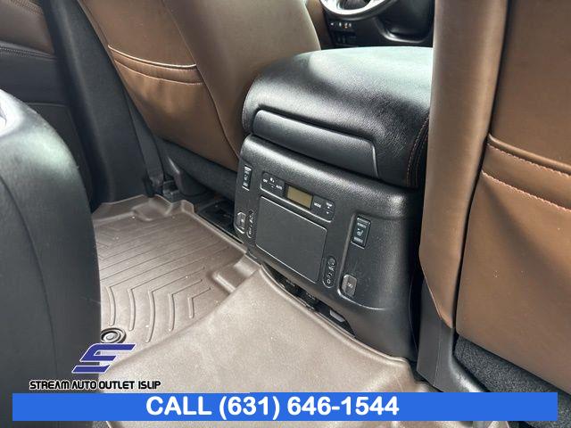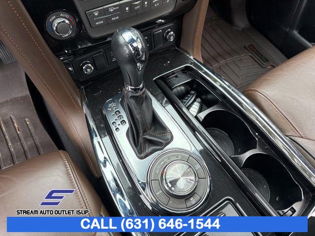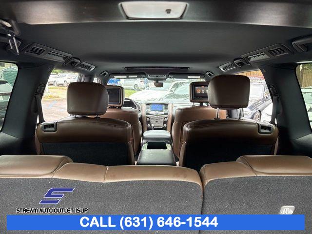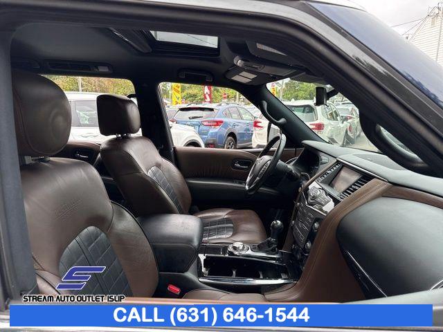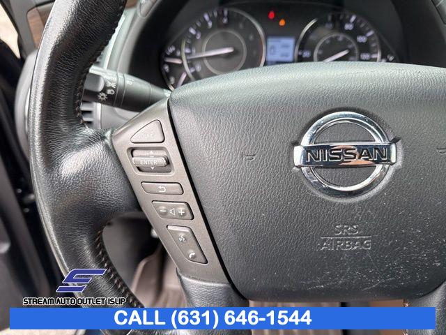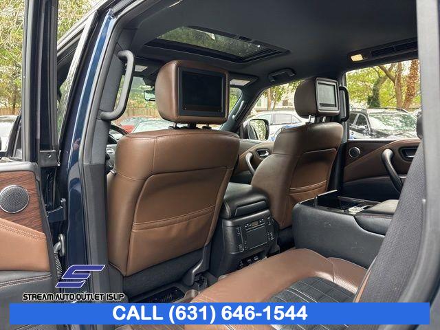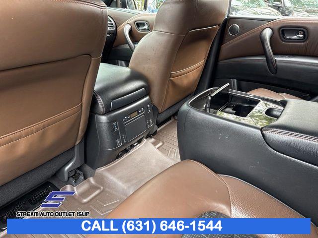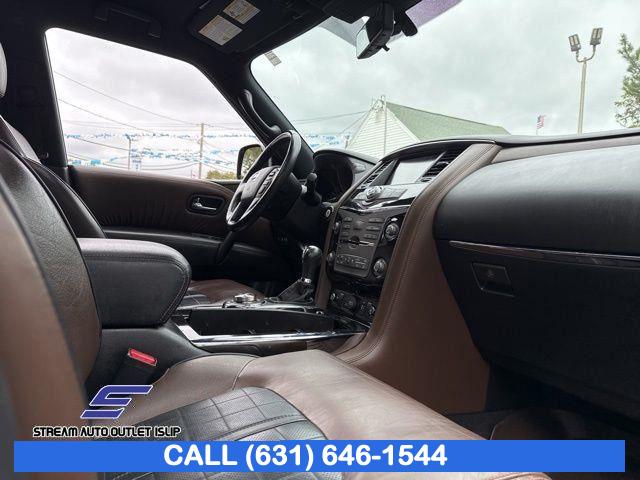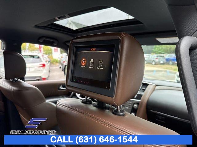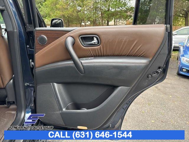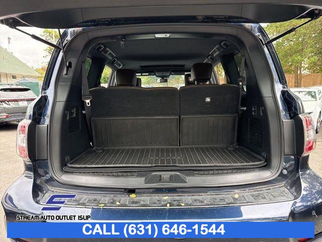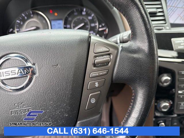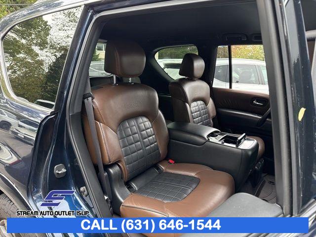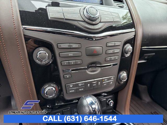 Navigation System, Captain's Chairs Package, Cargo Package, Carpeted Floor Mats w/ Captain Seat Package, Interior Lighting Package, Platinum Reserve Package, 13 Speakers, AM/FM radio: SiriusXM, CD player, Radio data system, Radio: AM/FM/SXM/CD/MP3/HD, Air Conditioning, Automatic temperature control, Front dual zone A/C, Rear air conditioning, Rear window defroster, Memory seat, Power driver seat, Power steering, Power windows, Remote keyless entry, Steering wheel memory, Steering wheel mounted audio controls, A/V remote, Headphones, Auto-leveling suspension, Cross Bars, Four wheel independent suspension, Speed-sensing steering, Traction control, 4-Wheel Disc Brakes, ABS brakes, Anti-whiplash front head restraints, Dual front impact airbags, Dual front side impact airbags, Emergency communication system: NissanConnect Services, Front anti-roll bar, Low tire pressure warning, Occupant sensing airbag, Overhead airbag, Rear anti-roll bar, Power moonroof, Power Liftgate, Brake assist, Electronic Stability Control, Delay-off headlights, Front fog lights, Fully automatic headlights, Panic alarm, Security system, Speed control, Auto-dimming door mirrors, Bumpers: body-color, Heated door mirrors, Power door mirrors, Roof rack: rails only, Spoiler, Turn signal indicator mirrors, Auto tilt-away steering wheel, Auto-dimming Rear-View mirror, Driver door bin, Driver vanity mirror, Front reading lights, Garage door transmitter: HomeLink, Heated & Cooled Front Bucket Seats w/Driver Memory, Heated steering wheel, Illuminated entry, Illuminated Kick Plates, Leather Shift Knob, Outside temperature display, Overhead console, Passenger vanity mirror, Rear reading lights, Rear seat center armrest, Tachometer, Telescoping steering wheel, Tilt steering wheel, Trip computer, Voltmeter, Welcome Lighting, 2nd Row Captain's Chairs, 2nd Row Center Console w/ Padded Armrest, 3rd row seats: split-bench, Front Bucket Seats, Front Center Armrest, Heated front seats, Heated rear seats, Leather-Appointed Seat Trim, Power passenger seat, Reclining 3rd row seat, Split folding rear seat, Two-Tone Semi-Aniline Leather Seat Trim, Ventilated front seats, Passenger door bin, Alloy wheels, Wheels: 20" Dark Chrome Alloy, Wheels: 20" Machine-Faced Chrome w/Tinted CC, Rain sensing wipers, Rear window wiper, Speed-Sensitive Wipers, Variably intermittent wipers, 2.937 Axle Ratio
