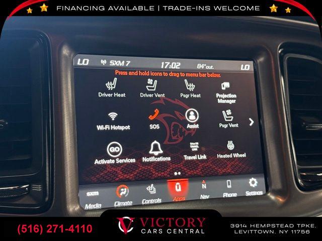 GPS Navigation, Driver Convenience Group, Dynamics Package, harman/kardon Audio Group w/Subwoofer, Plus Package, Quick Order Package 24G R/T Scat Pack, 18 Speakers Premium Audio System, 5-Year SiriusXM Traffic Service, 5-Year SiriusXM Travel Link Service, 6 Speakers, AM/FM radio: SiriusXM, GPS Antenna Input, harman/kardon GreenEdge Amp, HD Radio, Integrated Center Stack Radio, Media Hub (2 USB, AUX), Radio data system, Radio: Uconnect 4C Nav w/8.4" Display, Radio: Uconnect 4C w/8.4" Display, Shark Fin Antenna, SiriusXM Satellite Radio, Trunk Mounted Subwoofer, Air Conditioning, Automatic temperature control, Front dual zone A/C, Rear window defroster, Power driver seat, Power steering, Power windows, Radio/Driver Seat/Mirrors Memory, Remote keyless entry, Steering wheel mounted audio controls, Flat-Bottom Steering Wheel, Four wheel independent suspension, Power Tilt/Telescope Steering Column, Speed-sensing steering, Traction control, 4-Wheel Disc Brakes, ABS brakes, Anti-whiplash front head restraints, Brembo 6-Pot Fixed Front Caliper Brakes, Dual front impact airbags, Dual front side impact airbags, Emergency communication system: SiriusXM Guardian, Front anti-roll bar, Low tire pressure warning, Overhead airbag, Rear anti-roll bar, Red Brake Calipers, Blind Spot & Cross Path Detection, Brake assist, Electronic Stability Control, ParkView Rear Back-Up Camera, Delay-off headlights, Front fog lights, Fully automatic headlights, High-Intensity Discharge Headlamps, Panic alarm, Security system, Speed control, 230MM Rear Axle, Adaptive Damping Suspension, Bumpers: body-color, Front License Plate Bracket, Heated door mirrors, Power door mirrors, Power Multi-Function Foldaway Mirrors, Spoiler, 1-Yr SiriusXM Guardian Trial, 4G LTE Wi-Fi Hot Spot, 8.4" Touchscreen Display, Apple CarPlay, Apple CarPlay/Android Auto, Auto-dimming Rear-View mirror, Compass, Door Trim Panel w/Ambient Lighting, Driver door bin, Driver vanity mirror, For Details, Visit DriveUconnect.com, Front reading lights, Garage door transmitter, Google Android Auto, Heated Steering Wheel, Heated steering wheel, Illuminated entry, Integrated Voice Command w/Bluetooth, Leather Shift Knob, Outside temperature display, Overhead console, Passenger vanity mirror, Premium-Stitched Dash Panel, Rear reading lights, Rear seat center armrest, Scat Pack Logo Houndstooth Seat, SiriusXM Traffic Plus, SiriusXM Travel Link, Sport steering wheel, Surround Sound, Tachometer, Telescoping steering wheel, Tilt steering wheel, Trip computer, USB Host Flip, Front Bucket Seats, Front Center Armrest, Heated front seats, Split folding rear seat, Passenger door bin, Alloy wheels, Wheels: 20" x 9.5" Forged/Painted Aluminum, Wheels: 20" x 9" Lo Gloss Granite Crystal, Variably intermittent wipers, 3.09 Rear Axle Ratio