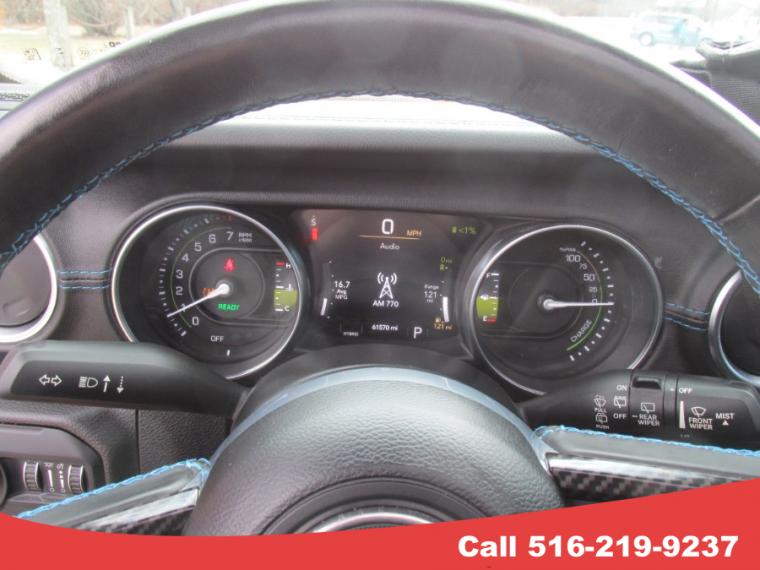 • 4 Cylinder Engine, ABS, 4-Wheel Disc Brakes, 8-Speed A/T, A/C, A/T, Adjustable Steering Wheel, Security System, Aluminum Wheels, AM/FM Stereo, Transmission w/Dual Shift Mode, Automatic Headlights, Auxiliary Audio Input, Back-Up Camera, Brake Actuated Limited Slip Differential, Brake Assist, Bucket Seats, Child Safety Locks, Climate Control, Cruise Control, Daytime Running Lights, Driver Air Bag, Driver Illuminated Vanity Mirror, Driver Adjustable Lumbar, Driver Vanity Mirror, Multi-Zone A/C, Auto-Dimming Rearview Mirror, Stability Control, Fog Lamps, Four Wheel Drive, Floor Mats, Tow Hooks, Conventional Spare Tire, HD Radio, Heated Mirrors, Intermittent Wipers, Keyless Entry, Keyless Start, Leather Steering Wheel, LED Headlights, Lithium Ion Traction Battery, Locking/Limited Slip Differential, MP3 Capability, Navigation System, Telematics, Pass-Through Rear Seat, Passenger Air Bag, Passenger Air Bag Sensor, Passenger Illuminated Visor Mirror, Passenger Vanity Mirror, Plug-In Electric/Gas, Power Door Locks, Power Mirror(s), Power Steering, Power Windows, Premium Sound System, Privacy Glass, Rear Bench Seat, Requires Subscription, Rollover Protection Bars, Satellite Radio, Front Side Air Bag, Smart Device Integration, Steering Wheel Audio Controls, Tire Pressure Monitor, Tires - Front All-Terrain, Tires - Rear All-Terrain, Traction Control, Trip Computer, Turbocharged, Universal Garage Door Opener, Variable Speed Intermittent Wipers, Immobilizer, WiFi Hotspot, Bluetooth Connection, Aluminum Spare Wheel, Auto On/Off Reflector Led Low/High Beam Daytime Running Headlamps w/Delay-Off, Black Door Handles, Black Front Bumper w/2 Tow Hooks, Black Power Heated Side Mirrors w/Manual Folding, Black Rear Bumper w/1 Tow Hook, Black Side Windows Trim, Black Wheel Well Trim and Black Fender Flares, Body-Color Grille w/Colored Accents, Deep Tinted Glass, Front Fog Lamps, Full-Size Spare Tire Mounted Outside Rear, Galvanized Steel/Aluminum/Magnesium Panels, LED Brakelights, Manual Convertible Top w/Fixed Roll-Over Protection and Top, Paint w/Decal, Removable Rear Window, Swing-Out Rear Cargo Access, Tailgate/Rear Door Lock Included w/Power Door Locks, Tires: LT285/70R17C BSW Off-Road, Variable Intermittent Wipers, Wheels: 17" x 7.5" Machined/Painted Black, 2 12V DC Power Outlets, 2 12V DC Power Outlets and 1 Interior 120V AC Power Outlet, 2 Seatback Storage Pockets, 4-Way Passenger Seat -inc: Manual Recline and Fore/Aft Movement, 4G LTE Wi-Fi Hot Spot Mobile Hotspot Internet Access, 6-Way Driver Seat -inc: Manual Recline, Height Adjustment, Fore/Aft Movement and Manual Lumbar Support, 60-40 Folding Split-Bench Front Facing Flip Forward Cushion/Seatback Premium Cloth Rear Seat, Air Filtration, Analog Appearance, Cargo Space Lights, Carpet Floor Trim, Carpet And Rubber Mat, Compass, Cruise Control w/Steering Wheel Controls, Day-Night Auto-Dimming Rearview Mirror, Delayed Accessory Power, Driver And Passenger Visor Vanity Mirrors w/Driver And Passenger Illumination and Passenger Auxiliary Mirror, Driver Information Center, Fade-To-Off Interior Lighting, Front And Rear Map Lights, Front Center Armrest w/Storage, Front Seats w/Cloth Back Material and Manual Driver Lumbar, Full Carpet Floor Covering -inc: Carpet Front And Rear Floor Mats, Full Floor Console w/Locking Storage, 2 12V DC Power Outlets and 1 Interior 120V AC Power Outlet, Garage Door Transmitter, Gauges -inc: Speedometer, Odometer, Voltmeter, Oil Pressure, Engine Coolant Temp, Tachometer, Inclinometer, Altimeter, Oil Temperature, Transmission Fluid Temp, Engine Hour Meter, Traction Battery Level, Power/Regen, Trip Odometer and Trip Computer, HVAC -inc: Console Ducts, Illuminated Front Cupholder, Illuminated Rear Cupholder, Instrument Panel Bin, Dashboard Storage, Driver / Passenger And Rear Door Bins, Integrated Navigation System w/Voice Activation, Interior Trim -inc: Colored Instrument Panel Insert, Metal-Look Door Panel Insert, Metal-Look Console Insert and Metal-Look Interior Accents, Leather Steering Wheel, Locking Cargo Area Concealed Storage, Locking Glove Box, Manual Adjustable Front Head Restraints and Foldable Rear Head Restraints, Manual Tilt/Telescoping Steering Column, Outside Temp Gauge, Perimeter Alarm, Power 1st Row Windows w/Driver And Passenger 1-Touch Down, Power Door Locks w/Autolock Feature, Power Fuel Flap Locking Type, Power Rear Windows and Removable 3rd Row Windows, Premium Cloth Low-Back Bucket Seats, Proximity Key For Push Button Start Only, Redundant Digital Speedometer, Remote Keyless Entry w/Integrated Key Transmitter, Illuminated Entry and Panic Button, Remote Releases -Inc: Power Fuel, Sentry Key Immobilizer, Smart Device Integration, Trip Computer, Urethane Gear Shifter Material, Voice Activated Dual Zone Front Automatic Air Conditioning, 1280# Maximum Payload, 17.2 Gal. Fuel Tank, 4.10 Rear Axle Ratio, 5 Skid Plates, 50 State Emissions, 600CCA Maintenance-Free Battery w/Run Down Protection, Auto Locking Hubs, Brake Actuated Limited Slip Differential, Driver Selectable Front Locking Differential, Driver Selectable Rear Locking Differential, Electro-Hydraulic Power Assist Steering, Engine Auto Stop-Start Feature, Engine: 2.0L I4 DOHC DI Turbo PHEV, Front And Rear Anti-Roll Bars, GVWR: 6, 400 lbs, HD Gas-Pressurized Shock Absorbers, Hybrid Electric Motor, Leading Link Front Suspension w/Coil Springs, Lithium Ion (li-Ion) Traction Battery w/7.2 kW Onboard Charger, 12 Hrs Charge Time @ 110/120V, 2.4 Hrs Charge Time @ 220/240V and 17.3 kWh Capacity, Manual Transfer Case, Part And Full-Time Four-Wheel Drive, Performance Suspension, Regenerative 4-Wheel Disc Brakes w/4-Wheel ABS, Front And Rear Vented Discs, Brake Assist, Hill Descent Control and Hill Hold Control, Single Stainless Steel Exhaust, Solid Axle Rear Suspension w/Coil Springs, Towing Equipment -inc: Trailer Sway Control, Transmission w/Autostick Sequential Shift Control, Transmission: 8-Speed Auto 8P75PH PHEV, ABS And Driveline Traction Control, Airbag Occu