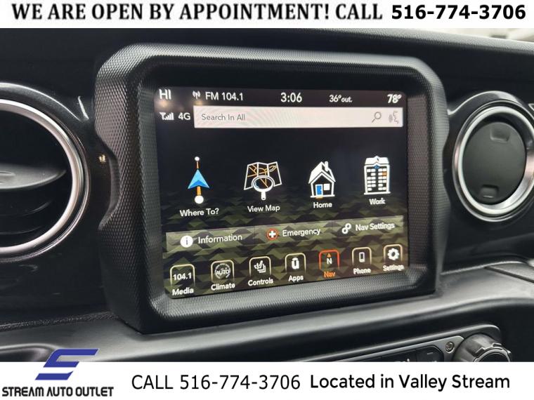 GPS Navigation, 8.4" Radio & Premium Audio Group, Altitude Package, Cold Weather Group, Dual Top Group, Quick Order Package 22L Altitude, Body Color 3-Piece Hard Top, 8 Speakers, Alpine Premium Audio System, AM/FM radio: SiriusXM, Apple CarPlay, GPS Antenna Input, HD Radio, Radio data system, Radio: Uconnect 4 w/7" Display, Radio: Uconnect 4C Nav w/8.4" Display, Air Conditioning, Automatic temperature control, Front dual zone A/C, Rear Window Defroster, Power steering, Power windows, Remote keyless entry, Steering wheel mounted audio controls, Heavy Duty Suspension w/Gas Shocks, Traction control, 4-Wheel Disc Brakes, ABS brakes, Dual front impact airbags, Dual front side impact airbags, Front anti-roll bar, Integrated roll-over protection, Low tire pressure warning, Occupant sensing airbag, Rear anti-roll bar, Remote Proximity Keyless Entry, Remote Start System, Brake assist, Electronic Stability Control, ParkView Rear Back-Up Camera, Delay-off headlights, Front fog lights, Fully automatic headlights, Panic alarm, Security system, Speed control, Aux Battery, Stop-Start Dual Battery System, Black Trail Rated Badge, Body Color Grille w/Gloss Black Rings, Front License Plate Bracket, Heated door mirrors, Matte Black Jeep Badge, Mold In Color Bumper w/Gloss Black, Non-Lock Fuel Cap w/o Discriminator, Power door mirrors, Premium Black Sunrider Soft Top w/Dual Top Group, 1-Year SiriusXM Guardian Trial, 4G LTE Wi-Fi Hot Spot, 5-Year SiriusXM Traffic Service, 5-Year SiriusXM Travel Link Service, 8.4" Touchscreen Display, Apple CarPlay/Android Auto, Auto-Dimming Rear-View Mirror, Black Interior Accents, Compass, Driver door bin, Driver vanity mirror, Emergency/Assistance Call, For Details, Visit DriveUconnect.com, Front reading lights, Garage door transmitter, Google Android Auto, Heated Steering Wheel, Illuminated entry, Integrated Voice Command w/Bluetooth, Leather steering wheel, Leather Wrapped Park Brake Handle, Leather Wrapped Shift Knob, Manufacturer's Statement of Origin, MOPAR All-Weather Floor Mats (DISC), MOPAR Hardtop Headliner, Outside temperature display, Passenger vanity mirror, Rear reading lights, SiriusXM Traffic Plus, SiriusXM Travel Link, Tachometer, Telescoping steering wheel, Tilt steering wheel, Trip computer, Voltmeter, Wizard Black Instrument Panel Bezels, Cloth Low-Back Bucket Seats, Front Bucket Seats, Heated Front Seats, Leather Trimmed Bucket Seats, Split folding rear seat, Freedom Panel Storage Bag, Front Center Armrest w/Storage, Passenger door bin, Alloy wheels, Wheels: 18" x 7.5" Gloss Black Aluminum, Wheels: 18" x 7.5" Polished w/Gray Spokes, Rear Window Wiper/Washer, Variably intermittent wipers, 3.45 Rear Axle Ratio, * NYS INSPECTION INCLUDED *, * FULL INTERIOR / EXTERIOR DETAIL *, * BLUETOOTH *, * LIMITED NYS LEMON LAW WARRANTY INCLUDED *, *FRESH OIL CHANGE *, * 150 MULTI POINT INSPECTION *