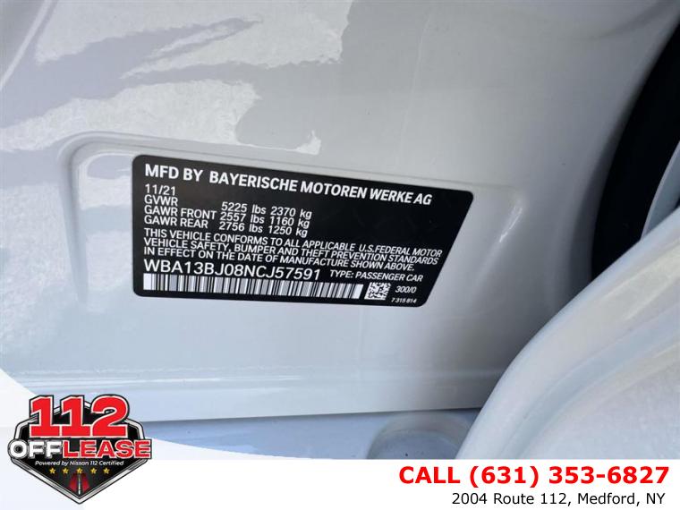 For more information on this 2022 BMW 530i, please call 112 Off Lease at (631) 353-6827 or with the contact form on this page. This vehicle's vin number is WBA13BJ08NCJ57591 and is recorded as being in stock at 112 Off Lease at 2004 Route 112 in Medford. See all cars from this dealership.