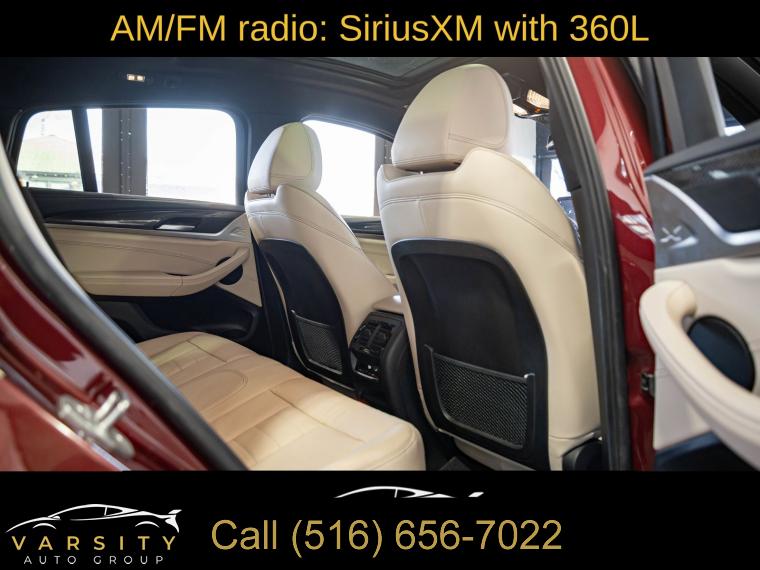 Navigation System, Connected Package Pro, 12 Speakers, AM/FM radio: SiriusXM with 360L, ConnectedDrive Services, harman/kardon Surround Sound System, Hi-Fi Sound System, Radio Control US, Radio data system, Radio: AM/FM Audio System, SiriusXM w/360L, Air Conditioning, Automatic temperature control, Front dual zone A/C, Rear air conditioning, Rear window defroster, Head-Up Display, Lumbar Support, Memory seat, Power driver seat, Power steering, Power windows, Remote keyless entry, Steering wheel mounted audio controls, Adaptive suspension, Four wheel independent suspension, Speed-sensing steering, Traction control, 4-Wheel Disc Brakes, ABS brakes, Anti-whiplash front head restraints, Dual front impact airbags, Dual front side impact airbags, Emergency communication system: BMW Assist eCall, Front anti-roll bar, Increased Top Speed Limiter, Knee airbag, Low tire pressure warning, Occupant sensing airbag, Overhead airbag, Rear anti-roll bar, Power moonroof: Panorama, Power Liftgate, Brake assist, Electronic Stability Control, Exterior Parking Camera Rear, Auto High-beam Headlights, Delay-off headlights, Fully automatic headlights, Panic alarm, Security system, Speed control, Auto-dimming door mirrors, Bumpers: body-color, Heated door mirrors, Power door mirrors, Spoiler, Turn signal indicator mirrors, Apple CarPlay & Android Auto Compatibility, Auto-dimming Rear-View mirror, BMW Assist eCall, BMW TeleServices, Carbon Fiber Trim, Driver door bin, Driver vanity mirror, Enhanced Bluetooth, Front reading lights, Garage door transmitter, Gesture Control, Heated Steering Wheel, Illuminated entry, Live Cockpit Pro w/Navi, Outside temperature display, Passenger vanity mirror, Rear reading lights, Rear seat center armrest, Sport steering wheel, Tachometer, Telescoping steering wheel, Tilt steering wheel, Trip computer, WiFi Hotspot, Adjustable Seat Width, Front Bucket Seats, Front Center Armrest, Heated Front Seats, Perforated SensaTec Upholstery, Power Front Seats, Power passenger seat, Split folding rear seat, Sport Seats, Passenger door bin, Alloy wheels, Wheels: 19" x 7.5" M Y-Spoke Bi-Color (Style 887M), Wheels: 20" x 8.0" Fr & 20" x 9.5" Rr (Style 787M), Rain sensing wipers, Speed-Sensitive Wipers, Variably intermittent wipers, 3.39 Axle Ratio, 2022 BMW X4 M40i, Piemont Red, Oyster w/Vernasca Leather Upholstery