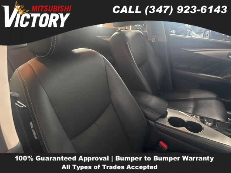 18" x 7.5" Aluminum Alloy Wheels, Heated Front Bucket Seats, Leather Seating Surfaces, Radio: INFINITI InTouch w/AM/FM/HD/CD, Splash Guards, Rear USB Charging Ports, Cargo Package, ., First Aid Kit, Shopping Bag Hooks, Cargo Net, Trunk Mat, 4-Wheel Disc Brakes, Apple CarPlay/Android Auto, Emergency communication system: INFINITI Connection, Auto High-beam Headlights, AM/FM radio: SiriusXM, Compass, 16 Speakers, Speed-Sensitive Wipers, Auto-dimming Rear-View mirror, Blind Spot Warning, Front beverage holders, Variably intermittent wipers, Turn signal indicator mirrors, Trip computer, Traction control, Tilt steering wheel, Telescoping steering wheel, Steering wheel mounted audio controls, Steering wheel memory, Split folding rear seat, Speed control, Security system, Remote keyless entry, Rear window defroster, Rear seat center armrest, Rear reading lights, Rear anti-roll bar, Rain sensing wipers, Radio data system, Power windows, Power steering, Power passenger seat, Power moonroof, Power driver seat, Power door mirrors, Passenger vanity mirror, Passenger door bin, Panic alarm, Overhead console, Overhead airbag, Outside temperature display, Occupant sensing airbag, Memory seat, Low tire pressure warning, Leather steering wheel, Illuminated entry, Heated steering wheel, Heated front seats, Heated door mirrors, Garage door transmitter: HomeLink, Fully automatic headlights, Front reading lights, Front fog lights, Front dual zone A/C, Front anti-roll bar, Four wheel independent suspension, Dual front side impact airbags, Dual front impact airbags, Driver vanity mirror, Driver door bin, Delay-off headlights, CD player, Bumpers: body-color, Brake assist, Automatic temperature control, Auto tilt-away steering wheel, Alloy wheels, ABS brakes, Tachometer, Leather Shift Knob, Front Center Armrest, Front Bucket Seats, Electronic Stability Control, Air Conditioning