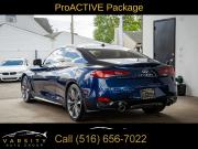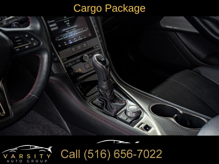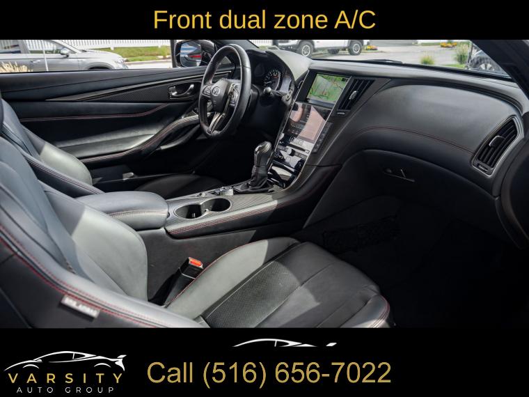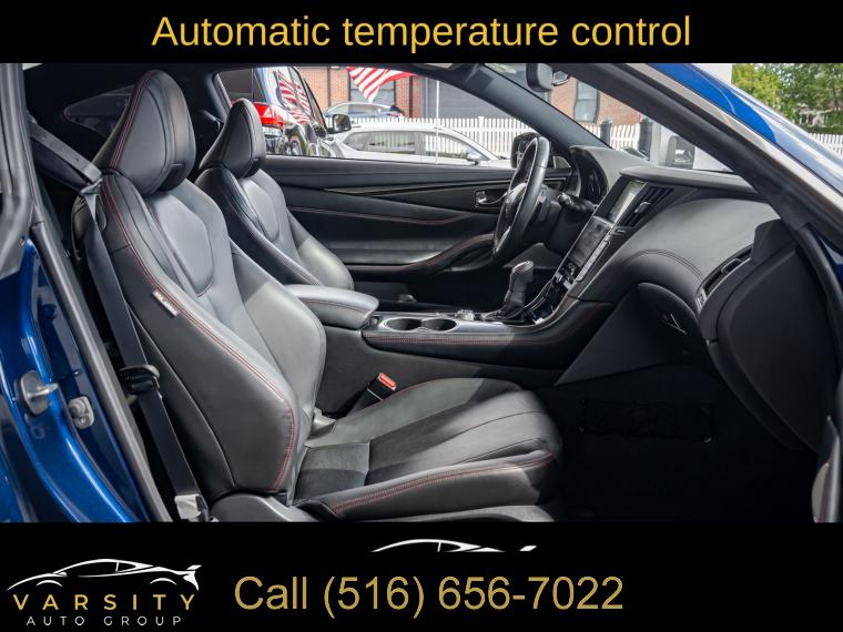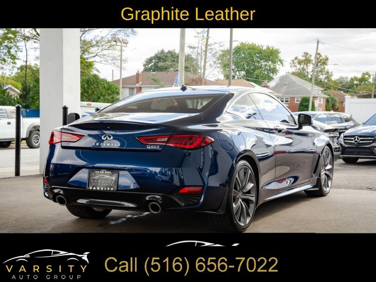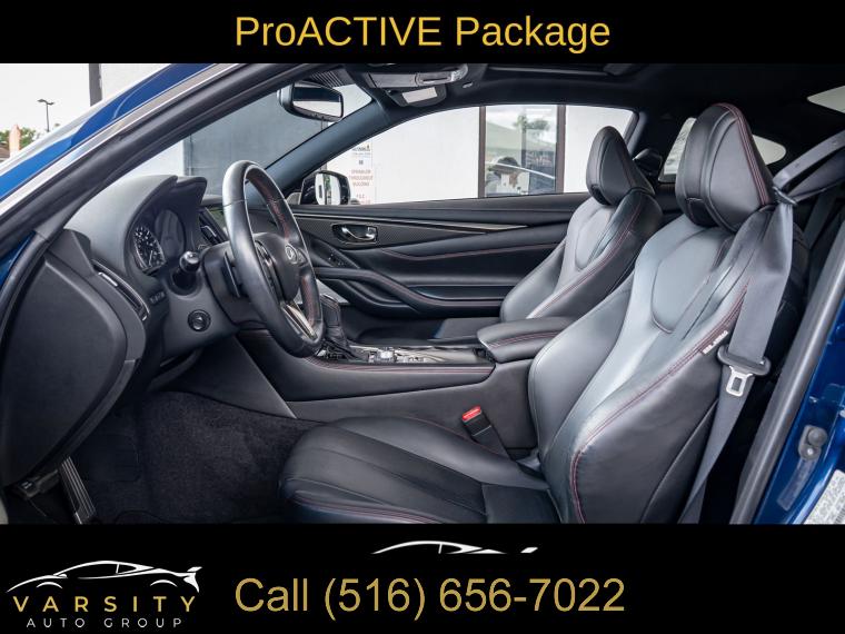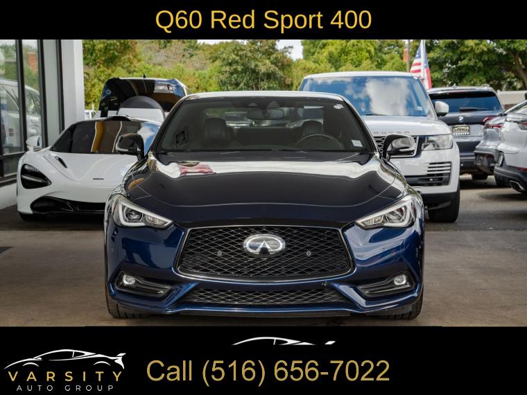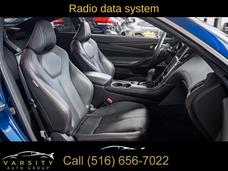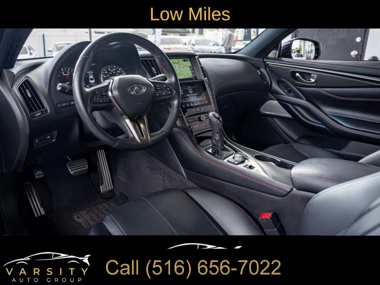 Q60 Red Sport 400, Grand Blue, Graphite Leather, Cargo Package, ProACTIVE Package, Apple CarPlay/Android Auto, 1 Owner, Low Miles, Clean CARFAX, 13 Speakers, 4-Wheel Disc Brakes, ABS brakes, Active Lane Control, Adaptive Front Lighting System, Adaptive suspension, Air Conditioning, Alloy wheels, AM/FM radio: SiriusXM, Apple CarPlay/Android Auto, Auto High-beam Headlights, Auto tilt-away steering wheel, Auto-dimming door mirrors, Auto-dimming Rear-View mirror, Automatic temperature control, Blind Spot Warning, Blind-Spot Intervention, Brake assist, Bumpers: body-color, Cargo Net, Cargo Package, Carpeted Trunk Mat, CD player, Compass, Delay-off headlights, Direct Adaptive Steering, Driver door bin, Driver vanity mirror, Dual front impact airbags, Dual front side impact airbags, ECO Pedal, Electronic Stability Control, Emergency communication system: INFINITI Connection, First Aid Kit, Four wheel independent suspension, Front anti-roll bar, Front Bucket Seats, Front Center Armrest, Front dual zone A/C, Front fog lights, Front reading lights, Front Seat Driver/Passenger Pre-Crash Seatbelts, Fully automatic headlights, Garage door transmitter: HomeLink, Heated door mirrors, Heated Front Bucket Seats, Heated front seats, Heated steering wheel, Illuminated entry, Illuminated Kick Plates, INFINITI Welcome Lighting, Lane Departure Prevention, Leather Shift Knob, Leather steering wheel, Literature Kit, Low tire pressure warning, Memory seat, Navigation System, Navigation system: INFINITI InTouch Navigation, Occupant sensing airbag, Outside temperature display, Overhead airbag, Overhead console, Panic alarm, Passenger door bin, Passenger vanity mirror, Power door mirrors, Power driver seat, Power moonroof, Power passenger seat, Power steering, Power windows, ProACTIVE Package, Radio data system, Radio: INFINITI InTouch w/AM/FM/HD/CD/Navigation, Rain sensing wipers, Rear anti-roll bar, Rear window defroster, Remote keyless entry, Security system, Semi-Aniline Leather-Appointed Seating Surfaces, Special Paint - Grand Blue, Speed control, Speed-sensing steering, Speed-Sensitive Wipers, Steering wheel memory, Steering wheel mounted audio controls, Tachometer, Telescoping steering wheel, Tilt steering wheel, Traction control, Trip computer, Turn signal indicator mirrors, Variably intermittent wipers, Wheels: 20" Staggered Aluminum-Alloy Sport. Grand Blue 2022 INFINITI Q60 Red Sport 400 RWD 7-Speed Automatic 3.0L V6 20/27 City/Highway MPG