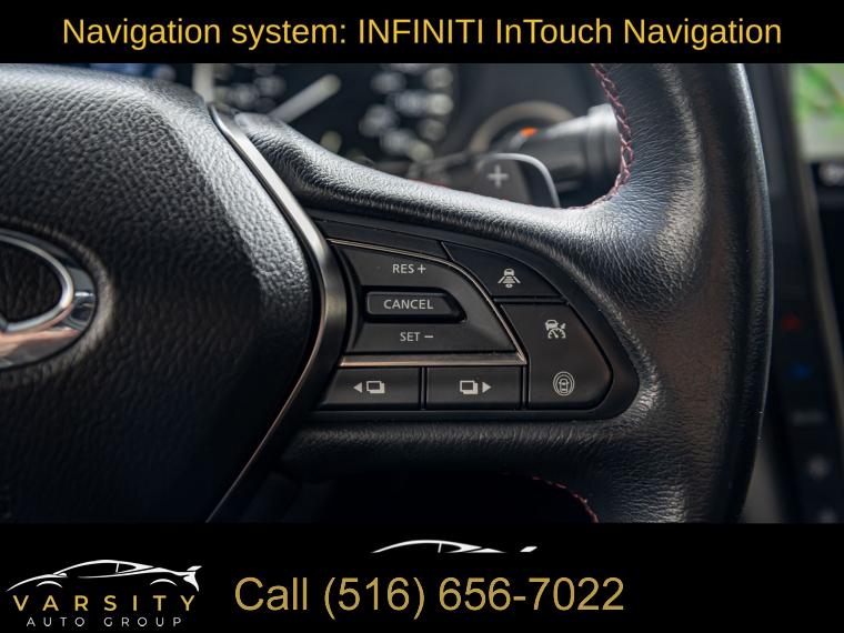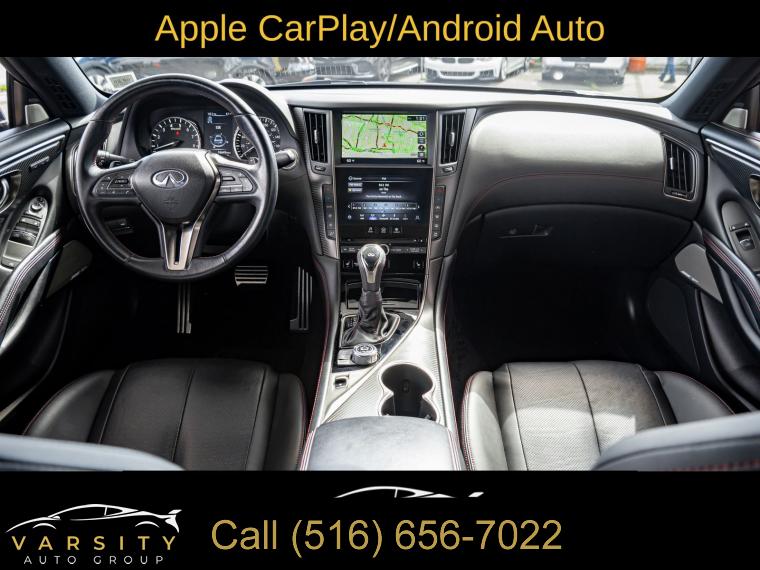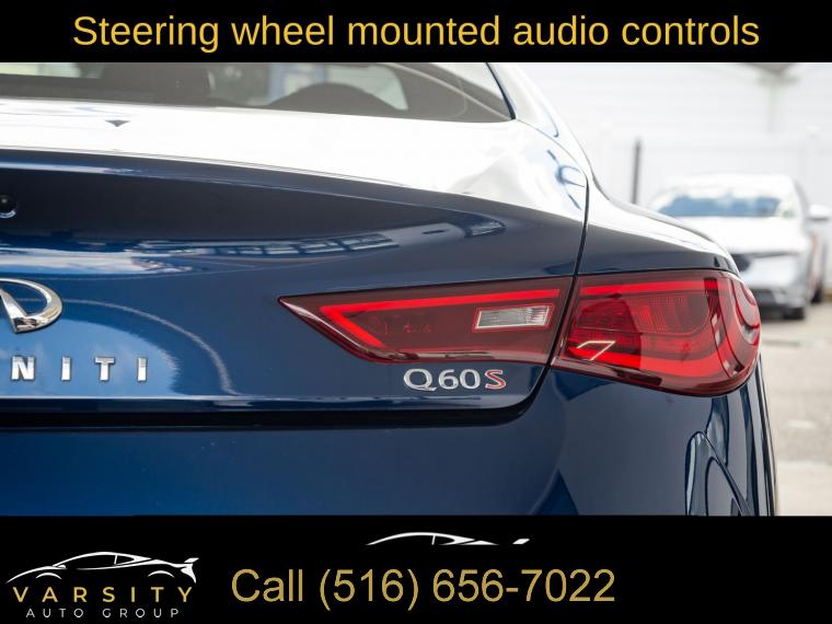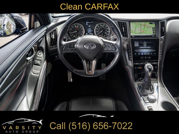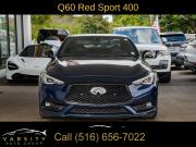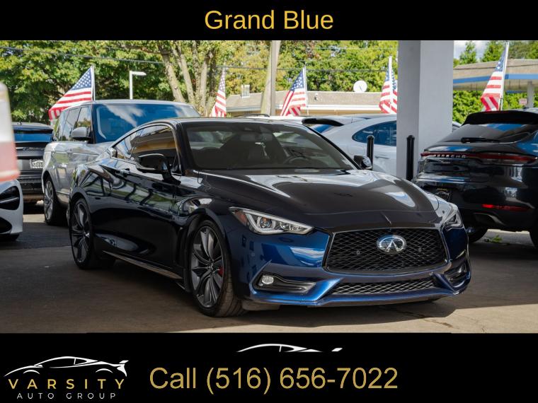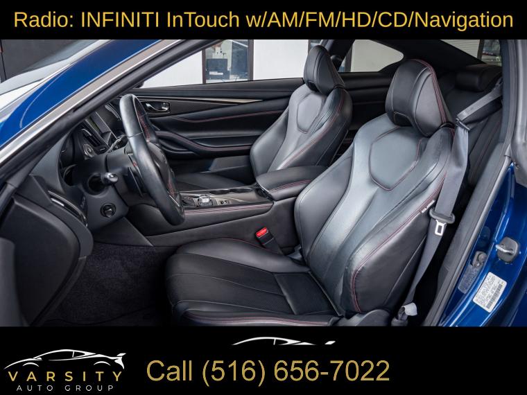 Navigation System, Navigation system: INFINITI InTouch Navigation, Cargo Package, ProACTIVE Package, 13 Speakers, AM/FM radio: SiriusXM, CD player, Radio data system, Radio: INFINITI InTouch w/AM/FM/HD/CD/Navigation, Air Conditioning, Automatic temperature control, Front dual zone A/C, Rear window defroster, Memory seat, Power driver seat, Power steering, Power windows, Remote keyless entry, Steering wheel memory, Steering wheel mounted audio controls, Adaptive suspension, Four wheel independent suspension, Speed-sensing steering, Traction control, 4-Wheel Disc Brakes, ABS brakes, Direct Adaptive Steering, Dual front impact airbags, Dual front side impact airbags, Emergency communication system: INFINITI Connection, Front anti-roll bar, Low tire pressure warning, Occupant sensing airbag, Overhead airbag, Rear anti-roll bar, Power moonroof, Blind Spot Warning, Brake assist, Electronic Stability Control, Adaptive Front Lighting System, Auto High-beam Headlights, Delay-off headlights, Front fog lights, Fully automatic headlights, First Aid Kit, Front Seat Driver/Passenger Pre-Crash Seatbelts, Panic alarm, Security system, Speed control, Auto-dimming door mirrors, Bumpers: body-color, Heated door mirrors, INFINITI Welcome Lighting, Power door mirrors, Special Paint - Grand Blue, Turn signal indicator mirrors, Active Lane Control, Apple CarPlay/Android Auto, Auto tilt-away steering wheel, Auto-dimming Rear-View mirror, Blind-Spot Intervention, Carpeted Trunk Mat, Compass, Driver door bin, Driver vanity mirror, ECO Pedal, Front reading lights, Garage door transmitter: HomeLink, Heated steering wheel, Illuminated entry, Illuminated Kick Plates, Lane Departure Prevention, Leather Shift Knob, Leather steering wheel, Literature Kit, Outside temperature display, Overhead console, Passenger vanity mirror, Tachometer, Telescoping steering wheel, Tilt steering wheel, Trip computer, Front Bucket Seats, Front Center Armrest, Heated Front Bucket Seats, Heated front seats, Power passenger seat, Semi-Aniline Leather-Appointed Seating Surfaces, Cargo Net, Passenger door bin, Alloy wheels, Wheels: 20" Staggered Aluminum-Alloy Sport, Rain sensing wipers, Speed-Sensitive Wipers, Variably intermittent wipers, Q60 Red Sport 400, Grand Blue, Graphite Leather, 1 Owner, Low Miles, Clean CARFAX