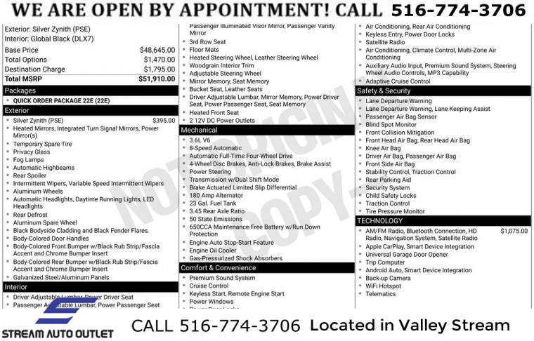 GPS Navigation, Quick Order Package 22E, 506 Watt Amplifier, 6 Speakers, 9 Amplified Speakers w/Subwoofer, Active Noise Control System, AM/FM radio: SiriusXM with 360L, Audio memory, GPS Antenna Input, HD Radio, Integrated Center Stack Radio, Radio data system, Radio: Uconnect 5 Nav w/10.1" Display, Radio: Uconnect 5 w/8.4" Display, SiriusXM Radio Service, SiriusXM Satellite Radio, SiriusXM w/360L, Air Conditioning, Automatic temperature control, Front dual zone A/C, Rear air conditioning, Rear window defroster, Memory seat, Power driver seat, Power steering, Power windows, Remote keyless entry, Steering wheel mounted audio controls, Four wheel independent suspension, Normal Duty Suspension, Traction control, 4-Wheel Disc Brakes, ABS brakes, Anti-whiplash front head restraints, Dual front impact airbags, Dual front side impact airbags, Emergency communication system, Front anti-roll bar, Knee airbag, Low tire pressure warning, Occupant sensing airbag, Overhead airbag, Rear anti-roll bar, Power Liftgate, Brake assist, Electronic Stability Control, ParkView Rear Back-Up Camera, Auto High-beam Headlights, Delay-off headlights, Front fog lights, Fully automatic headlights, Panic alarm, Security system, Speed control, Bumpers: body-color, Heated door mirrors, Power door mirrors, Spoiler, Turn signal indicator mirrors, USB Host Flip, 10.1" Touchscreen Display, 4G LTE Wi-Fi Hot Spot, All Radio Equipped Vehicles, Apple CarPlay, Capri Leather Seats, Compass, Connected Travel & Traffic Services, Connectivity - US/Canada, Disassociated Touchscreen Display, Driver door bin, Driver vanity mirror, For Details, Visit DriveUconnect.com, For More Info, Call 800-643-2112, Front reading lights, Garage door transmitter, Global Telematics Box Module (TBM), Google Android Auto, Heated steering wheel, Illuminated entry, Integrated Voice Command w/Bluetooth, Leather steering wheel, Outside temperature display, Overhead console, Passenger vanity mirror, Rear reading lights, Tachometer, Telescoping steering wheel, Tilt steering wheel, Trip computer, Voltmeter, 3rd row seats: split-bench, Front Bucket Seats, Heated front seats, Heated rear seats, Manual Fold Seatbacks, Power passenger seat, Reclining 3rd row seat, Split folding rear seat, Front Center Armrest w/Storage, Passenger door bin, Alloy wheels, Wheels: 18" x 8.0" Fully Painted Aluminum 2, Rear window wiper, Speed-Sensitive Wipers, Variably intermittent wipers, 3.45 Rear Axle Ratio, * NYS INSPECTION INCLUDED *, * FULL INTERIOR / EXTERIOR DETAIL *, * BLUETOOTH *, * LIMITED NYS LEMON LAW WARRANTY INCLUDED *, *FRESH OIL CHANGE *, * 150 MULTI POINT INSPECTION *