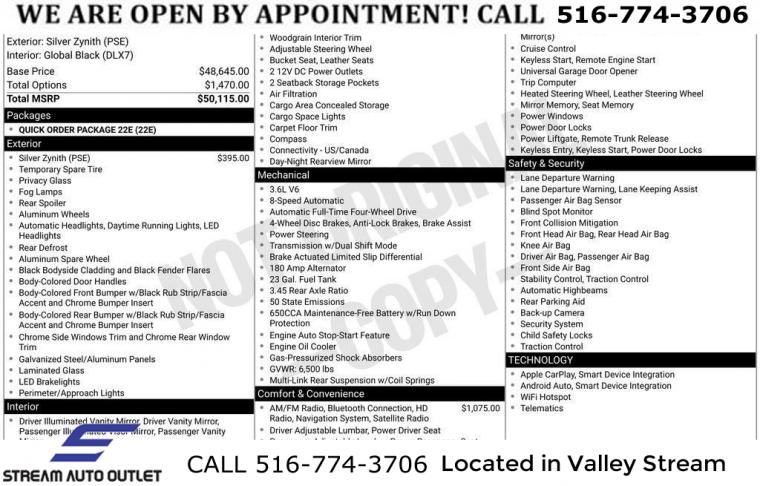 GPS Navigation, Quick Order Package 22E, 506 Watt Amplifier, 6 Speakers, 9 Amplified Speakers w/Subwoofer, Active Noise Control System, AM/FM radio: SiriusXM with 360L, Audio memory, GPS Antenna Input, HD Radio, Integrated Center Stack Radio, Radio data system, Radio: Uconnect 5 Nav w/10.1" Display, Radio: Uconnect 5 w/8.4" Display, SiriusXM Radio Service, SiriusXM Satellite Radio, SiriusXM w/360L, Air Conditioning, Automatic temperature control, Front dual zone A/C, Rear air conditioning, Rear window defroster, Memory seat, Power driver seat, Power steering, Power windows, Remote keyless entry, Steering wheel mounted audio controls, Four wheel independent suspension, Normal Duty Suspension, Traction control, 4-Wheel Disc Brakes, ABS brakes, Anti-whiplash front head restraints, Dual front impact airbags, Dual front side impact airbags, Emergency communication system, Front anti-roll bar, Knee airbag, Low tire pressure warning, Occupant sensing airbag, Overhead airbag, Rear anti-roll bar, Power Liftgate, Brake assist, Electronic Stability Control, ParkView Rear Back-Up Camera, Auto High-beam Headlights, Delay-off headlights, Front fog lights, Fully automatic headlights, Panic alarm, Security system, Speed control, Bumpers: body-color, Heated door mirrors, Power door mirrors, Spoiler, Turn signal indicator mirrors, USB Host Flip, 10.1" Touchscreen Display, 4G LTE Wi-Fi Hot Spot, All Radio Equipped Vehicles, Apple CarPlay, Capri Leather Seats, Compass, Connected Travel & Traffic Services, Connectivity - US/Canada, Disassociated Touchscreen Display, Driver door bin, Driver vanity mirror, For Details, Visit DriveUconnect.com, For More Info, Call 800-643-2112, Front reading lights, Garage door transmitter, Global Telematics Box Module (TBM), Google Android Auto, Heated steering wheel, Illuminated entry, Integrated Voice Command w/Bluetooth, Leather steering wheel, Outside temperature display, Overhead console, Passenger vanity mirror, Rear reading lights, Tachometer, Telescoping steering wheel, Tilt steering wheel, Trip computer, Voltmeter, 3rd row seats: split-bench, Front Bucket Seats, Heated front seats, Heated rear seats, Manual Fold Seatbacks, Power passenger seat, Reclining 3rd row seat, Split folding rear seat, Front Center Armrest w/Storage, Passenger door bin, Alloy wheels, Wheels: 18" x 8.0" Fully Painted Aluminum 2, Rear window wiper, Speed-Sensitive Wipers, Variably intermittent wipers, 3.45 Rear Axle Ratio, * NYS INSPECTION INCLUDED *, * FULL INTERIOR / EXTERIOR DETAIL *, * BACK UP CAMERA *, * NAVIGATION SYSTEM *, * BLUETOOTH *, * LEATHER SEATS *, * LIMITED NYS LEMON LAW WARRANTY INCLUDED *, *FRESH OIL CHANGE *, * 150 MULTI POINT INSPECTION *