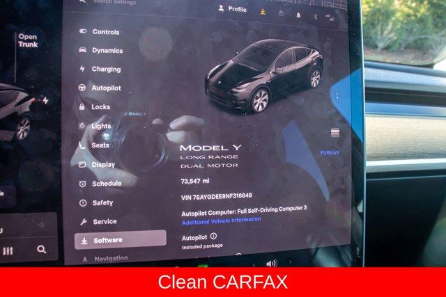 4-Wheel Disc Brakes, Brake assist, Exterior Parking Camera Rear, Four wheel independent suspension, Front dual zone A/C, Fully automatic headlights, Heated door mirrors, Heated front seats, Heated rear seats, Lane Departure Warning System, Memory seat, Navigation System, Power driver seat, Power Liftgate, Power passenger seat, Premium Audio System, Remote keyless entry, Security system, Speed control, Speed-sensing steering, Steering wheel mounted A/C controls. Priced below KBB Fair Purchase Price! Clean CARFAX. 127/117 City/Highway MPG2022 Tesla Model Y Long Range Black Long Range AWD 1-Speed Automatic Electric MotorSpecial pricing ad/promotion is available to customers who reference such pricing and present the ad at the time of sale otherwise store list price applies. Buyer is responsible to verify options/packages. Any error voids the ad. Certified Pre-Owned program available. Same-day delivery In-stock units only. Dealer-installed accessories are extra. Dealer is not responsible for typographical errors. Every vehicle in inventory is equipped with LoJack at an additional cost. The special price expires at the midnight of the publication date. For return & exchange policy visit the website for details. All Prices will be honored as cash prices. Prices do not include the following fees: Doc Fee, tax, tags, DMV fees. Pre-installed LoJack, and Pre-Certification (vary between vehicles) Please visit or call the dealership for complete details.