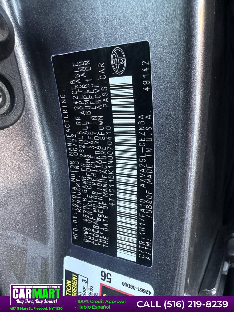 For more information on this 2022 Toyota Camry, please call Carmart One at 516-219-8239 or with the contact form on this page. This vehicle's vin number is 4T1C11BK1NU070410 and is recorded as being in stock at Carmart One at 497 N Main St. in Freeport. See all cars from this dealership.