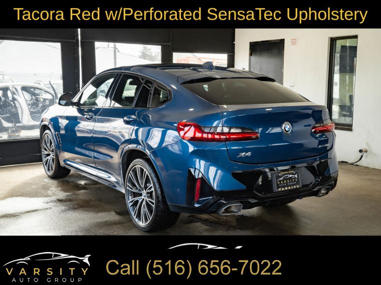 2023 BMW X4 xDrive30i, Phytonic Blue Metallic, Tacora Red w/Perforated SensaTec Upholstery, M Sport Package, Connected Package Pro, Parking Assistance Package, Remote Engine Start, One Owner, Clean CARFAX, 12 Speakers, 3.39 Axle Ratio, 4-Wheel Disc Brakes, ABS brakes, Active Park Distance Control, Aerodynamic Kit, Air Conditioning, Alloy wheels, Aluminum Trim, AM/FM radio: SiriusXM, Anti-whiplash front head restraints, Apple CarPlay & Android Auto Compatibility, Auto High-beam Headlights, Auto-dimming door mirrors, Auto-dimming Rear-View mirror, Automatic temperature control, BMW Assist eCall, BMW TeleServices, Brake assist, Bumpers: body-color, Connected Package Pro, ConnectedDrive Services, Delay-off headlights, Driver door bin, Driver vanity mirror, Dual front impact airbags, Dual front side impact airbags, Electronic Stability Control, Emergency communication system: BMW Assist eCall, Enhanced USB & Bluetooth w/Smartphone Integration, Exterior Parking Camera Rear, Four wheel independent suspension, Front anti-roll bar, Front Bucket Seats, Front Center Armrest, Front dual zone A/C, Front reading lights, Fully automatic headlights, Garage door transmitter, Genuine wood dashboard insert, Genuine wood door panel insert, Heated door mirrors, Heated Front Seats, Heated Steering Wheel, Hi-Fi Sound System, Illuminated entry, Knee airbag, Live Cockpit Pro w/Navi, Low tire pressure warning, M Sport Package, M Sport Pkg, M Steering Wheel, Memory seat, Navigation System, Occupant sensing airbag, Outside temperature display, Overhead airbag, Overhead console, Panic alarm, Parking Assistance Package, Parking Assistant Plus, Passenger door bin, Passenger vanity mirror, Perforated SensaTec Upholstery, Power door mirrors, Power driver seat, Power Front Seats, Power Liftgate, Power moonroof: Panorama, Power passenger seat, Power steering, Power windows, Radio data system, Radio: AM/FM Audio System, Rain sensing wipers, Rear air conditioning, Rear anti-roll bar, Rear reading lights, Rear seat center armrest, Rear window defroster, Rear-View Camera, Remote Engine Start, Remote keyless entry, Security system, Shadowline Exterior Trim, SiriusXM Satellite Radio, Smoke Grey Aluminum Rhombicle Trim, Speed control, Speed-sensing steering, Speed-Sensitive Wipers, Split folding rear seat, Sport Seats, Sport steering wheel, Steering wheel mounted audio controls, Surround View w/3D View, Tachometer, Telescoping steering wheel, Tilt steering wheel, Traction control, Trip computer, Turn signal indicator mirrors, Variably intermittent wipers, Wheels: 19" x 7.5" M Y-Spoke Bi-Color (Style 887M), Wheels: 19" x 7.5" Y-Spoke (Style 693), Wheels: 21" x 8.5" Fr/21" x 9.5" Rr (Style 726i), WiFi Hotspot, Without Exterior Lines Designation. Phytonic Blue Metallic 2023 BMW X4 xDrive30i AWD 8-Speed Automatic Sport 2.0L I4 TwinPower Turbo 21/28 City/Highway MPG