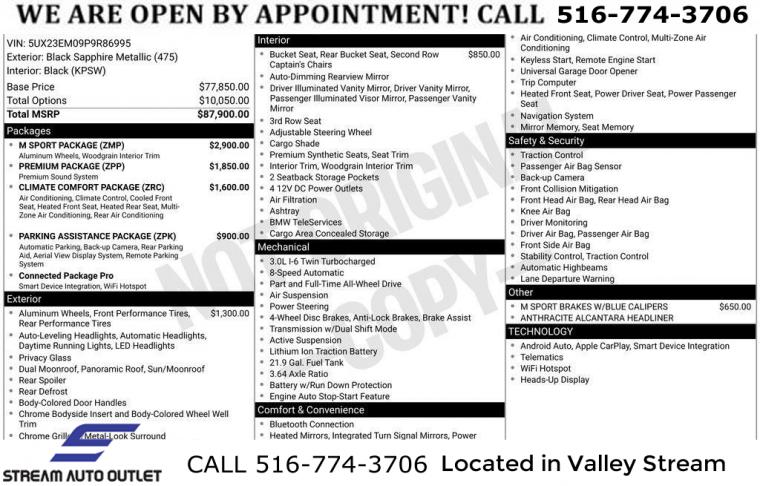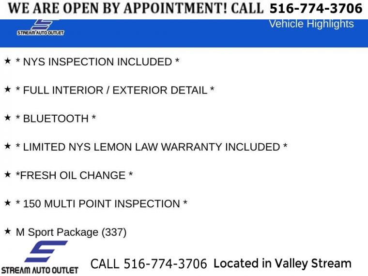 Navigation system: BMW Maps Navigation, Climate Comfort Package, Connected Package Pro, M Sport Package, M Sport Package (337), Parking Assistance Package, Premium Package, 10 Speakers, AM/FM radio: SiriusXM, AM/FM Stereo, harman/kardon Surround Sound System, Hi-Fi Sound System, Radio data system, SiriusXM Satellite Radio, 5-Zone Automatic Climate Control, Air Conditioning, Automatic temperature control, Front dual zone A/C, Rear air conditioning, Rear dual zone A/C, Rear window defroster, Head restraints memory, Heads-Up Display, Memory seat, Power driver seat, Power steering, Power windows, Remote keyless entry, Steering wheel memory, Steering wheel mounted audio controls, Adaptive suspension, Auto-leveling suspension, Four wheel independent suspension, Speed-sensing steering, Traction control, 4-Wheel Disc Brakes, ABS brakes, Dual front impact airbags, Dual front side impact airbags, Emergency communication system: BMW Assist eCall, Front anti-roll bar, Increased Top Speed Limiter, Knee airbag, Low tire pressure warning, M Sport Brakes w/Blue Calipers, Occupant sensing airbag, Overhead airbag, Power adjustable front head restraints, Rear anti-roll bar, Power moonroof: Panorama, Soft-Close Automatic Doors, Brake assist, Electronic Stability Control, Exterior Parking Camera Rear, Auto High-beam Headlights, Delay-off headlights, Fully automatic headlights, Panic alarm, Security system, Speed control, Aerodynamic Kit, Auto-dimming door mirrors, Bumpers: body-color, Heated door mirrors, Power door mirrors, Shadowline Exterior Trim, Spoiler, Turn signal indicator mirrors, Without Lines Designation Outside, Anthracite Alcantara Headliner, Apple CarPlay & Android Auto Compatibility, Apple CarPlay Compatibility, Auto tilt-away steering wheel, Auto-dimming Rear-View mirror, BMW Assist eCall, BMW TeleServices, Compass, ConnectedDrive Services, Drive Recorder, Driver door bin, Driver vanity mirror, Front reading lights, Garage door transmitter, Genuine wood console insert, Genuine wood dashboard insert, Genuine wood door panel insert, Gesture Control, Heated Multi-Contour Seats, Heated steering wheel, Illuminated entry, Live Cockpit Pro w/Navi, M Steering Wheel, Outside temperature display, Parking Assistant Professional, Passenger vanity mirror, Personal eSIM 5G, Rear reading lights, Rear seat center armrest, Sport steering wheel, Surround View w/3D View, Tachometer, Telescoping steering wheel, Tilt steering wheel, Trip computer, Wireless Charging Device, 2nd Row Captain's Chairs, 3rd row seats: split-bench, Front & Rear Heated Seats, Front Bucket Seats, Front Center Armrest, Front Ventilated Seats, Heated front seats, Power Front Seats, Power passenger seat, Reclining 3rd row seat, Sensafin Upholstery, Split folding rear seat, Passenger door bin, Alloy wheels, Wheels: 21" x 9.5" Double-Spoke Bi-Color Orbit Grey, Wheels: 21" x 9.5" Y-Spoke Bi-Color, Wheels: 22" x 9.5" Fr & 22" x 10.5" Rr Double-Spoke, Rear Electric Side Window Shades, Rain sensing wipers, Rear window wiper, Speed-Sensitive Wipers, Variably intermittent wipers, 3.64 Axle Ratio, * NYS INSPECTION INCLUDED *, * FULL INTERIOR / EXTERIOR DETAIL *, * BACK UP CAMERA *, * NAVIGATION SYSTEM *, * BLUETOOTH *, * SUNROOF / MOONROOF*, * LIMITED NYS LEMON LAW WARRANTY INCLUDED *, *FRESH OIL CHANGE *, * 150 MULTI POINT INSPECTION *, APPLE CAR PLAY/ANDROID AUTO