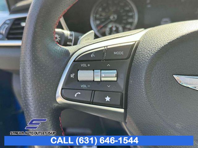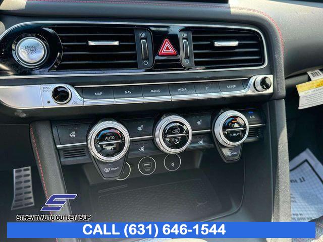 Navigation System, Option Group 02, Sport Prestige Package, 6 Speakers, AM/FM radio: SiriusXM, Radio: AM/FM/SiriusXM/HD Audio System, Radio: AM/FM/SiriusXM/HD Lexicon Prem Audio System, Air Conditioning, Automatic temperature control, Front dual zone A/C, Rear window defroster, Power driver seat, Power steering, Power windows, Remote keyless entry, Steering wheel mounted audio controls, Four wheel independent suspension, Traction control, 4-Wheel Disc Brakes, ABS brakes, Anti-whiplash front head restraints, Dual front impact airbags, Dual front side impact airbags, Emergency communication system: Genesis Connected Services, Front anti-roll bar, Knee airbag, Low tire pressure warning, Occupant sensing airbag, Overhead airbag, Rear anti-roll bar, Wide Sunroof, Brake assist, Electronic Stability Control, Exterior Parking Camera Rear, Auto High-beam Headlights, Delay-off headlights, Fully automatic headlights, Panic alarm, Security system, Speed control, Acoustic Front Door Glass, Bumpers: body-color, Dark Chrome Grille & Daylight Opening Trim, Heated door mirrors, Power door mirrors, Power Folding ECM Outside Mirrors, Turn signal indicator mirrors, Alloy Pedals, Android Auto & Apple CarPlay, Auto-dimming Rear-View mirror, Driver door bin, Driver vanity mirror, Forward & Reverse Parking Distance Warning, Front reading lights, Garage door transmitter: HomeLink, Heated Multi-Adjustable Front Bucket Seats, Heated steering wheel, Illuminated entry, Integrated Memory System (IMS), Outside temperature display, Overhead console, Passenger vanity mirror, Power Telescoping Steering Wheel, Rear reading lights, Rear seat center armrest, Sport Aluminum Trim, Tachometer, Telescoping steering wheel, Trip computer, Wireless Device Charging, 4-Way Power Lumbar Front Passenger Seat, Front Bucket Seats, Front Center Armrest, Front Passenger Seat Walk-In Device, Heated front seats, Leather Seating Surfaces, Leatherette Seating Surfaces, Power passenger seat, Split folding rear seat, Ventilated Front Seats, Passenger door bin, Alloy wheels, Wheels: 19" x 8.0J Fr & 19" x 8.5J Rr Alloy, Wheels: 19" x 8.0J Fr & 19" x 8.5J Rr Sport Alloy, Rain-Sensing Wipers, Speed-Sensitive Wipers, Variably intermittent wipers