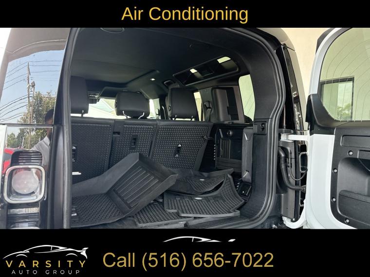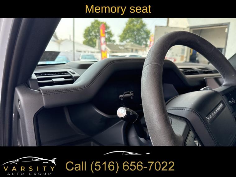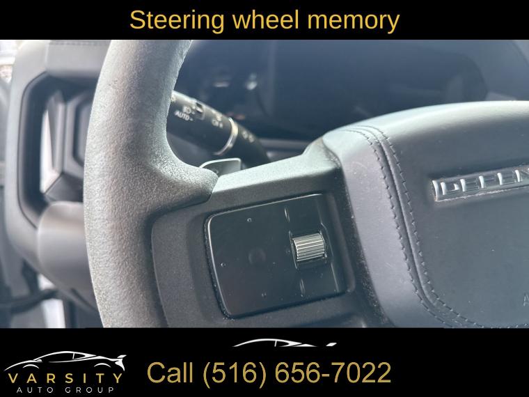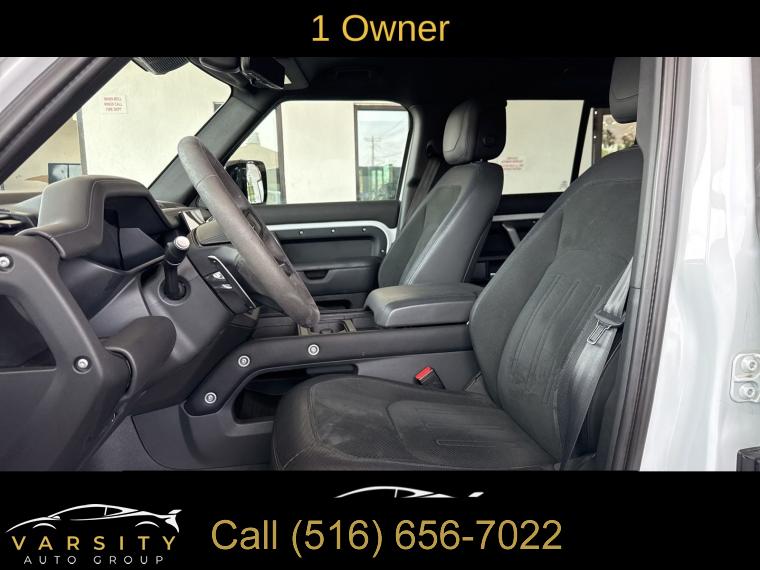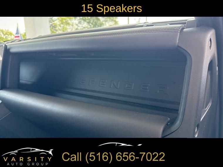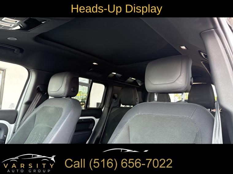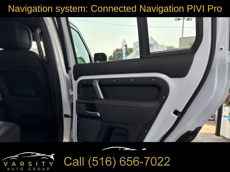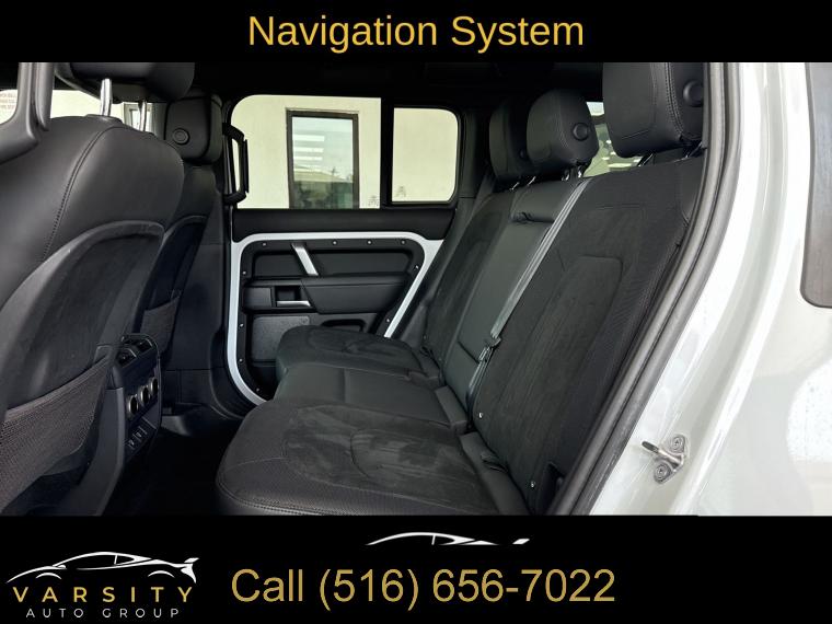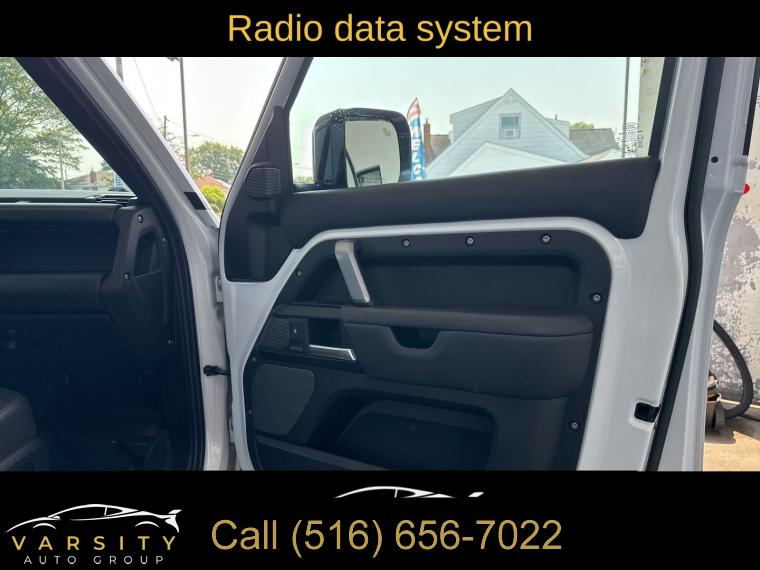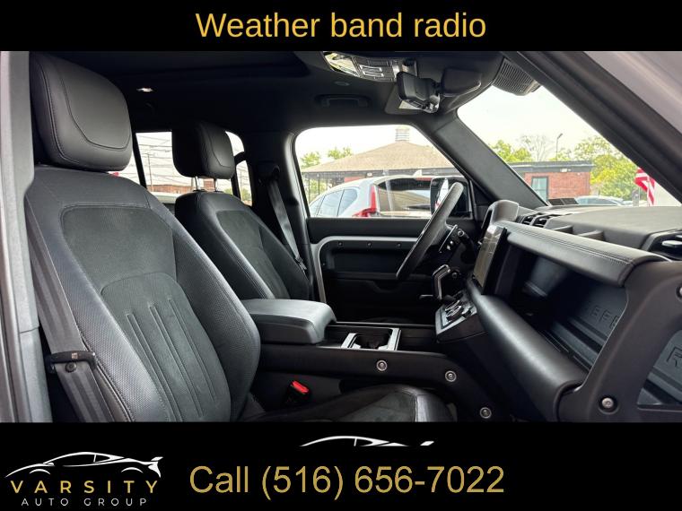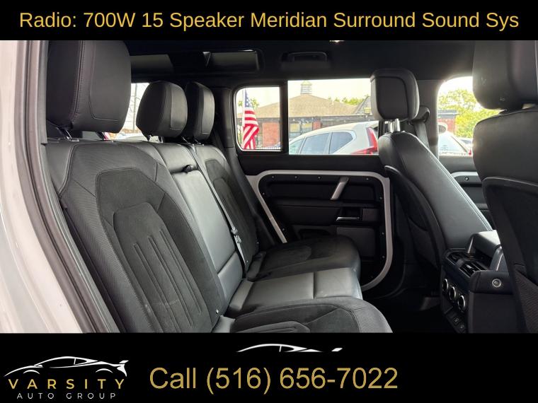 Navigation System, Navigation system: Connected Navigation PIVI Pro, 15 Speakers, AM/FM radio: SiriusXM, Radio data system, Radio: 700W 15 Speaker Meridian Surround Sound Sys, Weather band radio, Air Conditioning, Automatic temperature control, Front dual zone A/C, Rear air conditioning, Rear window defroster, Heads-Up Display, Memory seat, Power driver seat, Power steering, Power windows, Remote keyless entry, Steering wheel memory, Steering wheel mounted audio controls, Adaptive suspension, Four wheel independent suspension, Speed-sensing steering, Traction control, 4-Wheel Disc Brakes, ABS brakes, Dual front impact airbags, Dual front side impact airbags, Front anti-roll bar, Low tire pressure warning, Occupant sensing airbag, Overhead airbag, Rear anti-roll bar, Power moonroof, Brake assist, Electronic Stability Control, Exterior Parking Camera Rear, Auto High-beam Headlights, Delay-off headlights, Front fog lights, Fully automatic headlights, Headlight cleaning, Rear fog lights, Panic alarm, Security system, Active Cruise Control, Speed control, Auto-dimming door mirrors, Bumpers: body-color, Heated door mirrors, Power door mirrors, 14-Way Heated & Cooled Electric Memory Seats, Apple CarPlay & Android Auto, Auto tilt-away steering wheel, Auto-dimming Rear-View mirror, Compass, Driver door bin, Driver vanity mirror, Front reading lights, Garage door transmitter: HomeLink, Heated steering wheel, Illuminated entry, Leather Shift Knob, Outside temperature display, Overhead console, Passenger vanity mirror, Rear reading lights, Rear seat center armrest, Tachometer, Telescoping steering wheel, Tilt steering wheel, Trip computer, Front Bucket Seats, Front Center Armrest, Heated front seats, Heated rear seats, Power passenger seat, Split folding rear seat, Ventilated front seats, Windsor Leather Seat Trim, Passenger door bin, Alloy wheels, Wheels: 22" Gloss Dark Grey Style 5098, Rain sensing wipers, Rear window wiper, Speed-Sensitive Wipers, Variably intermittent wipers, 3.55 Axle Ratio, The Price you See, is the Price You Pay!!!, 2023 Land Rover Defender 110, Fuji White, Ebony w/Windsor Leather & Robustec Seats, 5.0L V8, 4WD, 1 Owner, Clean CARFAX