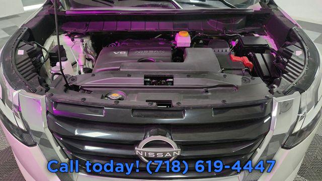 Navigation system: NissanConnect Navigation, 6 Speakers, AM/FM radio: SiriusXM, Bose Premium Audio System, Radio data system, Radio: AM/FM Audio System, Air Conditioning, Automatic temperature control, Front dual zone A/C, Rear air conditioning, Rear window defroster, Power driver seat, Power steering, Power windows, Remote keyless entry, Steering wheel mounted audio controls, Cross Bars, Four wheel independent suspension, Speed-sensing steering, Traction control, 4-Wheel Disc Brakes, ABS brakes, Dual front impact airbags, Dual front side impact airbags, Emergency communication system: NissanConnect Services, Front anti-roll bar, Knee airbag, Low tire pressure warning, Occupant sensing airbag, Overhead airbag, Rear anti-roll bar, Rear side impact airbag, Power Liftgate, Brake assist, Electronic Stability Control, Exterior Parking Camera Rear, Auto High-beam Headlights, Delay-off headlights, Fully automatic headlights, Panic alarm, Security system, Speed control, Black Splash Guards (Set of 4), Bumpers: body-color, Heated door mirrors, LED Fog Lamps, Power door mirrors, Spoiler, Turn signal indicator mirrors, Auto-dimming Rear-View mirror, Bench Seat Carpeted Floor Mats (Set of 4), Driver door bin, Driver vanity mirror, Front reading lights, Garage door transmitter: HomeLink, Heated steering wheel, Illuminated entry, Leather steering wheel, NissanConnect w/Navigation & Services, Outside temperature display, Overhead console, Passenger vanity mirror, Rear reading lights, Rear seat center armrest, Tachometer, Telescoping steering wheel, Tilt steering wheel, Trip computer, 3rd row seats: bench, Front Bucket Seats, Front Center Armrest, Heated Front Bucket Seats, Heated front seats, Leather Seating Surfaces, Power passenger seat, Reclining 3rd row seat, Split folding rear seat, Passenger door bin, 18" Machined Alloy Wheels, Alloy wheels, Rear window wiper, Variably intermittent wipers, Axle Ratio: 4.334