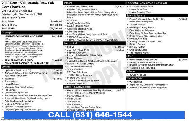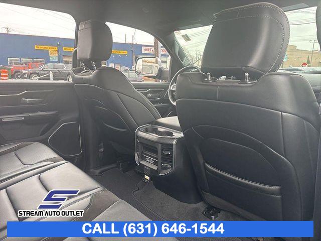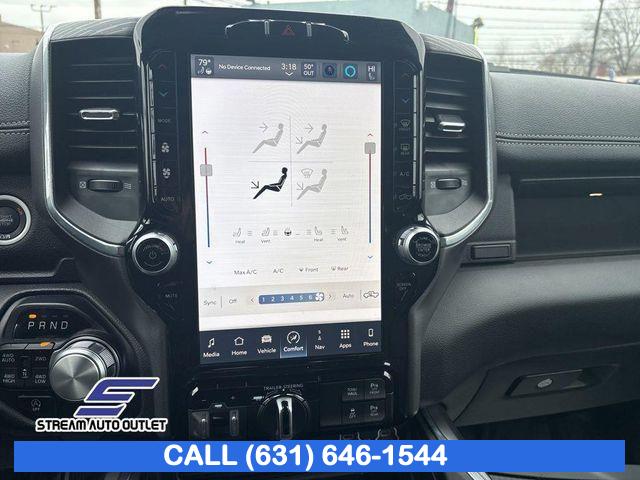 GPS Navigation, Navigation System, Laramie Level B Equipment Group, Quick Order Package 27H Laramie, Trailer Tow Group, 10 Speakers, AM/FM radio: SiriusXM with 360L, Audio memory, GPS Antenna Input, harman/kardon 19 Speaker Premium Sound, HD Radio, Integrated Center Stack Radio, Radio data system, Radio: Uconnect 5 Nav w/12.0" Display, Radio: Uconnect 5 Nav w/8.4" Display, SiriusXM Radio Service, SiriusXM w/360L, Air Conditioning, Automatic temperature control, Front dual zone A/C, Rear Window Defroster, Driver Seat Memory, Exterior Mirrors w/Memory, Memory seat, Pedal memory, Power driver seat, Power steering, Power windows, Rear 60/40 Folding Seat, Rear Power Sliding Window, Remote keyless entry, Steering wheel mounted audio controls, Traction control, 4-Wheel Disc Brakes, ABS brakes, Dual front impact airbags, Dual front side impact airbags, Front anti-roll bar, Front wheel independent suspension, Low tire pressure warning, Occupant sensing airbag, Overhead airbag, Rear anti-roll bar, Remote Tailgate Release, Blind Spot & Cross Path Detection, Brake assist, Electronic Stability Control, ParkView Rear Back-Up Camera, Delay-off headlights, Front fog lights, Fully automatic headlights, Panic alarm, Security system, Speed control, Electric Shift-On-Demand Transfer Case, 48V Belt Starter Generator, Auto High Beam Headlamp Control, Auto-dimming door mirrors, Auto-Dimming Exterior Driver Mirror, Bumpers: chrome, Chrome Exterior Mirrors, Chrome Power-Fold Trailer Tow Mirrors (DISC), Convex Wide-Angle Exterior Mirror Insert, Exterior Mirrors Courtesy Lamps, Exterior Mirrors w/Heating Element, Exterior Mirrors w/Supplemental Signals, For More Info, Call 800-643-2112, Front LED Fog Lamps, Front License Plate Bracket, Heated door mirrors, LED Reflector Headlamps, Mirror Clearance/Running Lights, Mirror-Mounted Aux Reverse Lamps, Power door mirrors, Power-Folding Mirrors, RAM Grille Badge - Chrome, Rear step bumper, Rear Wheelhouse Liners, Trailer Tow Mirrors, Turn signal indicator mirrors, USB Host Flip, #1 Seat Foam Cushion, 12" Touchscreen Display, 2nd Row In Floor Storage Bins, 4G LTE Wi-Fi Hot Spot, Adjustable pedals, Apple CarPlay, Apple CarPlay/Android Auto, Auto-dimming Rear-View mirror, Compass, Connected Travel & Traffic Services, Connectivity - US/Canada, Disassociated Touchscreen Display, Driver door bin, Driver vanity mirror, Foam Bottle Insert (Door Trim Panel), For Details, Visit DriveUconnect.com, Front Door Accent Lighting, Front reading lights, Garage door transmitter, Global Telematics Box Module (TBM), Google Android Auto, Heated Steering Wheel, Heated steering wheel, Illuminated entry, Integrated Voice Command w/Bluetooth, Leather steering wheel, Outside temperature display, Overhead console, ParkSense Front/Rear Park Assist w/Stop (DISC), Passenger vanity mirror, Rear Door Accent Lighting, Rear seat center armrest, Tachometer, Telescoping steering wheel, Tilt steering wheel, Trip computer, Voltmeter, 3 Rear Seat Head Restraints, 4 Way Front Headrests, Heated Front Seats, Heated front seats, Leather Trim 40/20/40 Bench Seat, Power 2-Way Driver Lumbar Adjust, Power 2-Way Passenger Lumbar Adjust, Power 8-Way Driver & Passenger Seats, Power passenger seat, Split folding rear seat, Ventilated Front Seats, Ventilated front seats, Front Center Armrest w/Storage, Front Seat Back Map Pockets, Passenger door bin, Rear Underseat Compartment Storage, Class IV Receiver Hitch, Trailer Brake Control, Trailer Light Check, Trailer Reverse Steering Control, Trailer Tire Pressure Monitoring System, Alloy wheels, Wheels: 18" x 8" Aluminum Base Painted, Wheels: 20" x 9" Premium Paint/Polished, Rain Sensitive Windshield Wipers, Variably intermittent wipers, * NYS INSPECTION INCLUDED *, * FULL INTERIOR / EXTERIOR DETAIL *, * LIMITED NYS LEMON LAW WARRANTY INCLUDED *, *FRESH OIL CHANGE *, * 150 MULTI POINT INSPECTION *