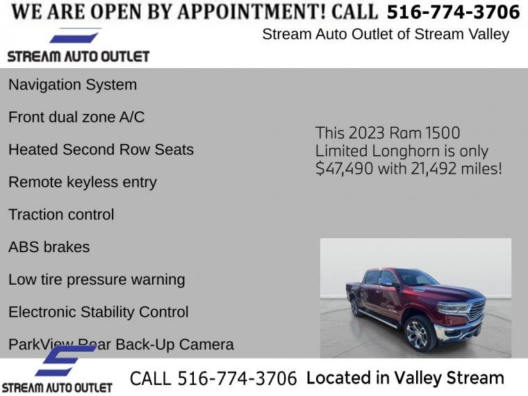 For more information on this 2023 RAM 1500, please call Stream Auto Outlet Valley Stream at (516) 774-3706 or with the contact form on this page. This vehicle's vin number is 1C6SRFKT6PN654269 and is recorded as being in stock at Stream Auto Outlet Valley Stream at 324 W Merrick Rd in Valley Stream. See all cars from this dealership.