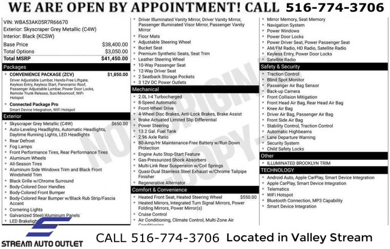 • Navigation, Navigation System, Connected Package Pro, Convenience Package, 10 Speakers, AM/FM radio: SiriusXM, Hi-Fi Sound System, Radio data system, Radio: AM/FM Audio System, SiriusXM Satellite Radio w/1 Year Subscription, Air Conditioning, Automatic temperature control, Front dual zone A/C, Rear window defroster, Comfort Access Keyless Entry, Lumbar Support, Memory seat, Power driver seat, Power steering, Power windows, Remote keyless entry, Steering wheel mounted audio controls, Four wheel independent suspension, Speed-sensing steering, Traction control, 4-Wheel Disc Brakes, ABS brakes, Dual front impact airbags, Dual front side impact airbags, Emergency communication system: BMW Assist eCall, Front anti-roll bar, Knee airbag, Low tire pressure warning, Occupant sensing airbag, Overhead airbag, Rear anti-roll bar, Panoramic Moonroof, Brake assist, Electronic Stability Control, Exterior Parking Camera Rear, Auto High-beam Headlights, Delay-off headlights, Front fog lights, Fully automatic headlights, Panic alarm, Security system, Speed control, Auto-dimming door mirrors, Bumpers: body-color, Heated door mirrors, Power door mirrors, Turn signal indicator mirrors, Apple CarPlay & Android Auto Compatibility, Apple CarPlay Compatibility, Auto-dimming Rear-View mirror, BMW Assist eCall, BMW TeleServices, Compass, ConnectedDrive Services, Driver door bin, Driver vanity mirror, Enhanced USB & Bluetooth, Front reading lights, Heated Steering Wheel, Illuminated entry, Outside temperature display, Passenger vanity mirror, Rear reading lights, Rear seat center armrest, Sport steering wheel, Tachometer, Telescoping steering wheel, Tilt steering wheel, Trip computer, Wireless Charging, Front Bucket Seats, Front Center Armrest, Heated Front Seats, Heated Front Seats & Steering Wheel, Power Front Seats, Power passenger seat, SensaTec Upholstery, Split folding rear seat, Sport Seats, Passenger door bin, Alloy wheels, Wheels: 17" x 7.5" Double-Spoke, Rain sensing wipers, Speed-Sensitive Wipers, Variably intermittent wipers, * NYS INSPECTION INCLUDED *, * FULL INTERIOR / EXTERIOR DETAIL *, * BACK UP CAMERA *, * NAVIGATION SYSTEM *, * BLUETOOTH *, * SUNROOF / MOONROOF*, * LIMITED NYS LEMON LAW WARRANTY INCLUDED *, *FRESH OIL CHANGE *, * 150 MULTI POINT INSPECTION *, APPLE CAR PLAY/ANDROID AUTO