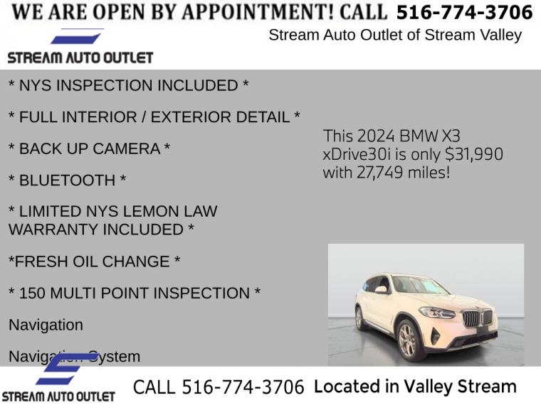 For more information on this 2024 BMW X3, please call Stream Auto Outlet Valley Stream at (516) 774-3706 or with the contact form on this page. This vehicle's vin number is 5UX53DP0XR9W14894 and is recorded as being in stock at Stream Auto Outlet Valley Stream at 324 W Merrick Rd in Valley Stream. See all cars from this dealership.