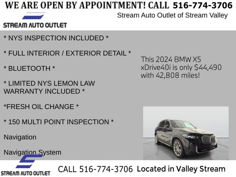 For more information on this 2024 BMW X5, please call Stream Auto Outlet Valley Stream at (516) 774-3706 or with the contact form on this page. This vehicle's vin number is 5UX23EU09R9T70779 and is recorded as being in stock at Stream Auto Outlet Valley Stream at 324 W Merrick Rd in Valley Stream. See all cars from this dealership.