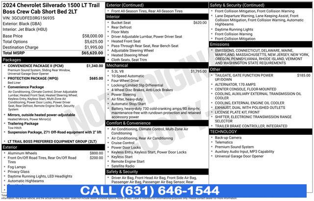 Convenience Package, Convenience Package II, Preferred Equipment Group 2LT, Protection Package, Suspension Package, Trailering Package, 2 USB Data Ports, 6 Speakers, 6-Speaker Audio System, AM/FM radio: SiriusXM with 360L, Dual Rear USB Ports (Charge Only), Premium audio system: Chevrolet Infotainment 3 Premium, Premium Bose 7-Speaker Sound System, Radio data system, Radio: Chevrolet Infotainment 3 Premium System, SiriusXM w/360L, Steering Wheel Audio Controls, Air Conditioning, Automatic temperature control, Dual-Zone Automatic Climate Control, Electric Rear-Window Defogger, Front dual zone A/C, Rear window defroster, 120-Volt Bed Mounted Power Outlet, 120-Volt Interior Power Outlet, Bluetooth® For Phone, EZ Lift Power Lock & Release Tailgate, Power driver seat, Power Front Windows w/Driver Express Up/Down, Power Front Windows w/Passenger Express Down, Power Rear Windows w/Express Down, Power steering, Power windows, Remote keyless entry, Remote Vehicle Starter System, Steering wheel mounted audio controls, Universal Home Remote, Auto-Locking Rear Differential, Speed-sensing steering, Traction control, Wrapped Steering Wheel, 4-Wheel Disc Brakes, ABS brakes, Dual front impact airbags, Dual front side impact airbags, Electrical Steering Column Lock, Front anti-roll bar, Front wheel independent suspension, Keyless Open & Start, Low tire pressure warning, Occupant sensing airbag, Overhead airbag, Power Tailgate, Brake assist, Electronic Stability Control, Hill Descent Control, Auto High-beam Headlights, Delay-off headlights, Front fog lights, Fully automatic headlights, Panic alarm, Security system, Theft Deterrent System (Unauthorized Entry), Electronic Cruise Control, Speed control, 170 Amp Alternator, 220 Amp Alternator, Auxiliary External Transmission Oil Cooler, External Engine Oil Cooler, Heavy-Duty Air Filter, Chevytec Spray-On Black Bedliner, Dual Exhaust w/Polished Outlets, Electronic Transmission Range Selector Shifter, Front LED Fog Lamps, Front License Plate Kit, Heated door mirrors, Heated Power-Adjustable Outside Mirrors, High Gloss Black Mirror Caps, IntelliBeam Automatic High Beam On/Off, LED Cargo Area Lighting, Power door mirrors, Rear step bumper, Rear Wheelhouse Liners, Single Outlet Exhaust, Standard Tailgate, 12.3" Multicolor Reconfigurable Digital Display, All-Weather Floor Liner (LPO) (AAK), Automatic Emergency Braking, Chevrolet Connected Access Capable, Cloth Seat Trim, Color-Keyed Carpeting Floor Covering, Compass, Driver door bin, Driver vanity mirror, Floor Mounted Center Console, Following Distance Indicator, Forward Collision Alert, Front Pedestrian Braking, Front reading lights, HD Rear Vision Camera, Heated Steering Wheel, Heated steering wheel, Illuminated entry, In-Vehicle Trailering System App, Inside Rear-View Mirror w/Tilt, Lane Keep Assist w/Lane Departure Warning, OnStar & Chevrolet Connected Services Capable, Outside temperature display, Overhead console, Passenger vanity mirror, Rear reading lights, Tachometer, Telescoping steering wheel, Tilt steering wheel, Trip computer, Voltmeter, Wi-Fi Hot Spot Capable, Wireless Charging, 10-Way Power Driver Seat w/Lumbar, 40/20/40 Front Split-Bench Seat, Front Bucket Seats, Heated Driver & Front Outboard Passenger Seats, Heated front seats, Rear 60/40 Folding Bench Seat (Folds Up), Split folding rear seat, Front Center Armrest w/Storage, Passenger door bin, Hitch Guidance, Hitch Guidance w/Hitch View, Integrated Trailer Brake Controller, Performance Red Recovery Hooks, Alloy wheels, Wheels: 18" x 8.5" Black Painted Aluminum, Wheels: 20" x 9" High Gloss Black Painted Alum, Deep-Tinted Glass, Power Sliding Rear Window w/Rear Defogger, Variably intermittent wipers
