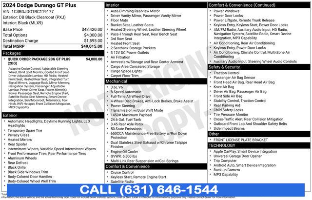 CARFAX One-Owner. Clean CARFAX. 2024 Dodge Durango DB Black Crystal Clearcoat AWD, Adaptive Cruise Control w/Stop, Apple CarPlay/Android Auto, Blind Spot w/Trailer Detection, Connected Travel & Traffic Services, Heated front seats, Heated Second Row Seats, Heated steering wheel, Heavy-Duty Engine Cooling, Integrated Roof Rail Crossbars, Navigation System, ParkView Rear Back-Up Camera, Power 8-Way Driver Memory 8-Way Passenger Seats, Power driver seat, Power Liftgate, Trailer Brake Control. Priced below KBB Fair Purchase Price!