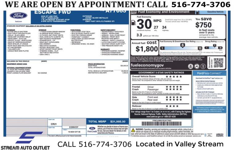 For more information on this 2024 Ford Escape, please call Stream Auto Outlet Valley Stream at (516) 774-3706 or with the contact form on this page. This vehicle's vin number is 1FMCU0MN1RUA77663 and is recorded as being in stock at Stream Auto Outlet Valley Stream at 324 W Merrick Rd in Valley Stream. See all cars from this dealership.