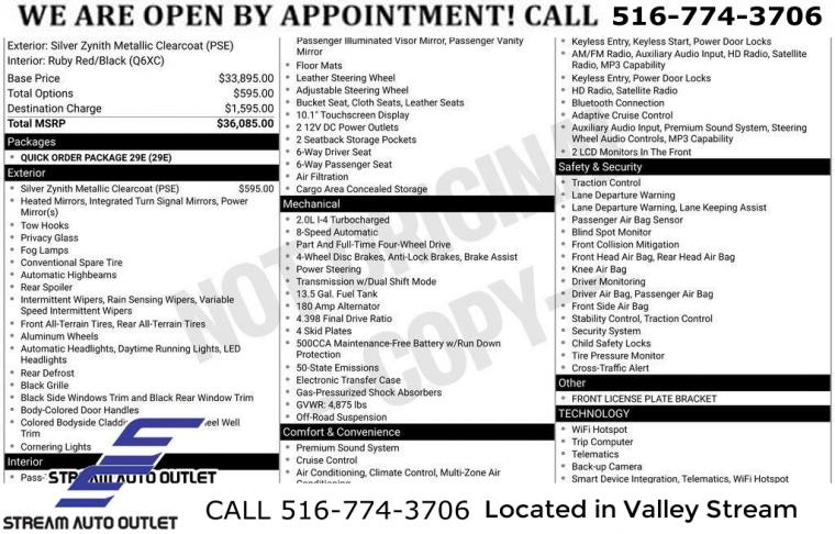Quick Order Package 29E, 6 Speakers, AM/FM radio: SiriusXM, Radio: Uconnect 5 w/10.1" Display, SiriusXM Radio Service, Air Conditioning, Automatic temperature control, Front dual zone A/C, Rear window defroster, Power steering, Power windows, Remote keyless entry, Steering wheel mounted audio controls, Four wheel independent suspension, Traction control, 4-Wheel Disc Brakes, ABS brakes, Dual front impact airbags, Dual front side impact airbags, Emergency communication system: Jeep Connect, Front anti-roll bar, Knee airbag, Low tire pressure warning, Occupant sensing airbag, Overhead airbag, Rear anti-roll bar, Brake assist, Electronic Stability Control, ParkView Rear Back-Up Camera, Auto High-beam Headlights, Delay-off headlights, Front fog lights, Fully automatic headlights, Panic alarm, Security system, Speed control, Bumpers: body-color, Front License Plate Bracket, Heated door mirrors, Power door mirrors, Spoiler, Turn signal indicator mirrors, 10.1" Touchscreen Display, 4G LTE Wi-Fi Hot Spot, Auto-dimming Rear-View mirror, Compass, Driver door bin, Driver vanity mirror, For Details, Visit DriveUconnect.com, For More Info, Call 800-643-2112, Front reading lights, Global Telematics Box Module (TBM), Illuminated entry, Leather Shift Knob, Leather steering wheel, Outside temperature display, Overhead console, Passenger vanity mirror, Premium Cloth/Leather Trim Bucket Seats, Rear seat center armrest, SiriusXM Guardian - Included Trial (B), Tachometer, Telescoping steering wheel, Tilt steering wheel, Trip computer, Front Bucket Seats, Split folding rear seat, Front Center Armrest w/Storage, Passenger door bin, Alloy wheels, Wheels: 17" x 6.5" Painted Black Aluminum, Rain sensing wipers, Rear window wiper, Variably intermittent wipers, 4.398 Final Drive Ratio, * NYS INSPECTION INCLUDED *, * FULL INTERIOR / EXTERIOR DETAIL *, * BLUETOOTH *, * LIMITED NYS LEMON LAW WARRANTY INCLUDED *, *FRESH OIL CHANGE *, * 150 MULTI POINT INSPECTION *