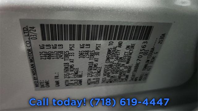 6 Speakers, AM/FM radio: SiriusXM, Radio data system, Radio: AM/FM NissanConnect, Air Conditioning, Automatic temperature control, Front dual zone A/C, Rear window defroster, Power driver seat, Power steering, Power windows, Remote keyless entry, Steering wheel mounted audio controls, Four wheel independent suspension, Traction control, 4-Wheel Disc Brakes, ABS brakes, Dual front impact airbags, Dual front side impact airbags, Emergency communication system: NissanConnect Services, Front anti-roll bar, Knee airbag, Low tire pressure warning, Occupant sensing airbag, Overhead airbag, Rear anti-roll bar, Rear side impact airbag, Power Liftgate, Brake assist, Electronic Stability Control, Rear Parking Sensors, Auto High-beam Headlights, Delay-off headlights, Fully automatic headlights, Panic alarm, Speed control, Bumpers: body-color, Heated door mirrors, Power door mirrors, Spoiler, Driver door bin, Driver vanity mirror, Front reading lights, Illuminated entry, NissanConnect featuring Apple CarPlay and Android Auto, Outside temperature display, Overhead console, Passenger vanity mirror, Rear seat center armrest, Tachometer, Telescoping steering wheel, Tilt steering wheel, Trip computer, Cloth Seat Trim w/Patterned Inserts, Front Bucket Seats, Front Center Armrest, Split folding rear seat, Passenger door bin, Alloy wheels, Wheels: 18" Dark Painted Machine Finished Alloy, Rear window wiper, Speed-Sensitive Wipers, Variably intermittent wipers, 5.676 Axle Ratio