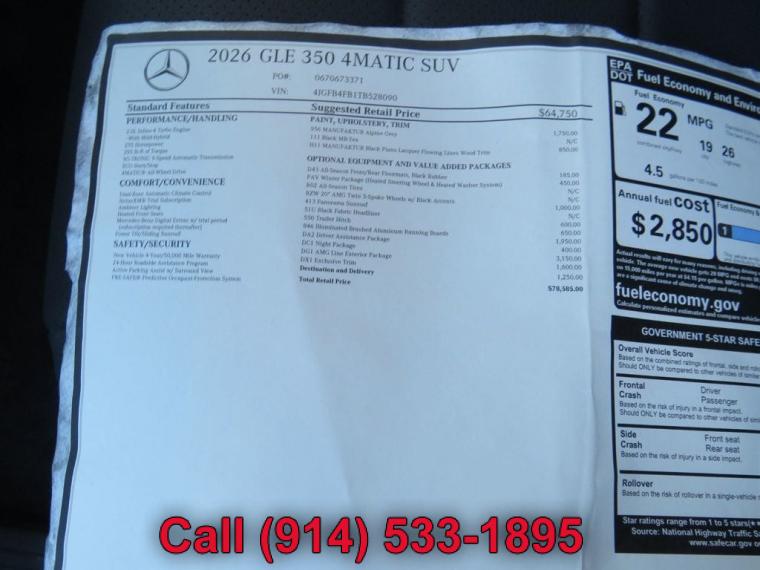 This 2026 Mercedes-Benz GLE 4dr GLE 350 4MATIC SUV (Clear Title) features a 2.0L 4 CYLINDER 4cyl engine. It is equipped with a 9 Speed Automatic transmission. The vehicle is Not Specified with a Not Specified interior. It is offered As-Is, extended warranty is available. - Air Conditioning, Climate Control, Dual Zone Climate Control, Cruise Control, Tinted Windows, Power Steering, Power Mirrors, Leather Steering Wheel, Clock, Tachometer, Homelink System, Telescoping Steering Wheel, Steering Wheel Radio Controls, Sunroof, Moonroof, Driver Airbag, Passenger Airbag, Side Airbags, Rear Defogger, Intermittent Wipers, AM/FM, Anti-Theft, Premium Sound System, Aux. Audio Input, Bluetooth, Carpeted Floor Mats, Center Arm Rest, Child Proof Door Locks, Daytime Running Lights, Heated Mirrors, Parking Sensors, Power Lift Gate, Rear Fog Lamps, Rear Heated Seats , Rear Spoiler, Rear Spoiler, Rear Wipers, Remote Trunk Lid, Reverse Camera, Roll Stability Control, Side Curtain Airbags, Sliding Rear Window, Tire Pressure Monitor, Vanity Mirrors - Contact Michael Maratto at (914) 533-1895 for more information. -