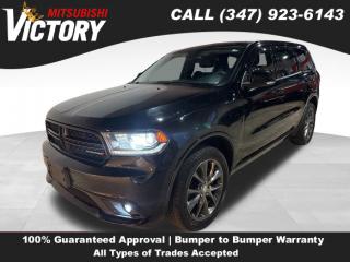 Comments Welcome to Victory Mitsubishi! We offer a combined inventory of 700 cars new and luxury used vehicles. All Used vehicles come with a quality assurance inspection, our New Vehicles have an unprecedented 10-year 100k mile warranty we also have vehicles car for any want or purpose. Come into test drive this car for any want or purpose. Come in to test drive this Dodge Durango GT today! *. 2017 Dodge Durango GT DB Black Crystal Clearcoat 4D Sport Utility Reviews: * Unusually spacious third-row seats; 8.4-inch touchscreen is one of the best in the class; assertive acceleration with the V8 engine; exceptional towing capacity for a crossover; real off-road capabilities with 4WD and low-range gearing. Source: Edmunds Save yourself Time and Money - Fill out a credit application online at victorymitsubishi.com and get pre-APPROVED! Financing available for all types of credit with low monthly payment that will fit you budget. Down Payment low as $599. Same day delivery. View our entire inventory by visiting our virtual showroom at victorymitsubishi.com - Only 2 blocks away from Exit 13 off I-95 or Minutes from exit 7 on the Hutchinson Parkway. While we make every effort to ensure the data listed here is correct, there may be instances where the pricing, options or vehicle features may be listed incorrectly. Dealer cannot be held liable for data that is listed incorrectly. to see more pictures of this vehicle or call us at (347) 923-6143 today to schedule your test drive. please refer to dealer’s website for exact pricing and for any incentives that we may apply! Our address is 4070 Boston Road, Bronx, NY 10475. * Options Quick Order Package 23E, 3.45 Rear Axle Ratio, Wheels: 20" x 8.0" Premium Painted Aluminum, Leather Trimmed Bucket Seats, Manufacturer's Statement of Origin, Nav & Power Liftgate Group, Radio: Uconnect 3C w/8.4" Display, Radio: Uconnect 3C Nav w/8.4" Display, Nav-Capable! See Dealer for Details, GPS Navigation, GPS Antenna Input, Power Liftgate, HD Radio, 8.4" Touchscreen Display, SiriusXM Travel Link, Roadside Assistance & 9-1-1 Call, SiriusXM Traffic, 5-Year SiriusXM Traffic Service, 5-Year SiriusXM Travel Link Service, Integrated Voice Command w/Bluetooth, 4-Wheel Disc Brakes, Emergency communication system: Uconnect Access, Exterior Parking Camera Rear, AM/FM radio: SiriusXM, Front Center Armrest w/Storage, Compass, Speed-Sensitive Wipers, Auto-dimming Rear-View mirror, Variably intermittent wipers, Turn signal indicator mirrors, Trip computer, Traction control, Tilt steering wheel, Telescoping steering wheel, Steering wheel mounted audio controls, Split folding rear seat, Speed control, Security system, Remote keyless entry, Rear window wiper, Rear window defroster, Rear seat center armrest, Rear reading lights, Rear anti-roll bar, Rear air conditioning, Radio data system, Power windows, Power steering, Power passenger seat, Power driver seat, Power door mirrors, Passenger vanity mirror, Passenger door bin, Panic alarm, Overhead console, Overhead airbag, Outside temperature display, Occupant sensing airbag, Memory seat, Low tire pressure warning, Knee airbag, Illuminated entry, Heated steering wheel, Heated rear seats, Heated front seats, Heated door mirrors, Garage door transmitter, Fully automatic headlights, Front reading lights, Front fog lights, Front dual zone A/C, Front anti-roll bar, Four wheel independent suspension, Dual front side impact airbags, Dual front impact airbags, Driver vanity mirror, Driver door bin, Delay-off headlights, Bumpers: body-color, Brake assist, Automatic temperature control, Auto-dimming door mirrors, Audio memory, Anti-whiplash front head restraints, Alloy wheels, Adjustable head restraints: driver and passenger w/tilt, ABS brakes, 3rd row seats: split-bench, Tachometer, Spoiler, Front Bucket Seats, Electronic Stability Control, Air Conditioning, 6 Speakers