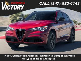 Comments Welcome to Victory Mitsubishi! We offer a combined inventory of 700 cars new and luxury used vehicles. All Used vehicles come with a quality assurance inspection, our New Vehicles have an unprecedented 10-year 100k mile warranty we also have vehicles car for any want or purpose. Come into test drive this car for any want or purpose. Come in to test drive this Alfa Romeo Stelvio Ti today! Priced below KBB Fair Purchase Price! *. CARFAX One-Owner. 2022 Alfa Romeo Stelvio Ti Alfa White 4D Sport Utility Save yourself Time and Money - Fill out a credit application online at victorymitsubishi.com and get pre-APPROVED! Financing available for all types of credit with low monthly payment that will fit you budget. Down Payment low as $599. Same day delivery. View our entire inventory by visiting our virtual showroom at victorymitsubishi.com - Only 2 blocks away from Exit 13 off I-95 or Minutes from exit 7 on the Hutchinson Parkway. While we make every effort to ensure the data listed here is correct, there may be instances where the pricing, options or vehicle features may be listed incorrectly. Dealer cannot be held liable for data that is listed incorrectly. to see more pictures of this vehicle or call us at (347) 923-6143 today to schedule your test drive. please refer to dealer’s website for exact pricing and for any incentives that we may apply! Our address is 4070 Boston Road, Bronx, NY 10475. * Options Navigation System, Quick Order Package 22G Ti, 8 Speakers, AM/FM radio: SiriusXM, Radio data system, Radio: AM/FM/HD 8.8" w/Navigation, Rear audio controls, Air Conditioning, Automatic temperature control, Front dual zone A/C, Rear window defroster, Memory seat, Power driver seat, Power steering, Power windows, Remote keyless entry, Steering wheel mounted audio controls, Four wheel independent suspension, Speed-sensing steering, Traction control, 4-Wheel Disc Brakes, ABS brakes, Dual front impact airbags, Dual front side impact airbags, Emergency communication system: SiriusXM Guardian - included trial, Front anti-roll bar, Knee airbag, Low tire pressure warning, Occupant sensing airbag, Overhead airbag, Rear anti-roll bar, Power moonroof, Power Liftgate, Brake assist, Electronic Stability Control, ParkView Rear Back-Up Camera, Auto High-beam Headlights, Delay-off headlights, Fully automatic headlights, Headlight cleaning, High intensity discharge headlights: Bi-Xenon, Rear fog lights, Panic alarm, Security system, Speed control, Auto-dimming door mirrors, Bumpers: body-color, Heated door mirrors, Power door mirrors, Silver Ti Badge, Spoiler, Turn signal indicator mirrors, Vesuvio Gray Body Kit, Apple CarPlay/Android Auto, Auto-dimming Rear-View mirror, Chocolate Seats w/Chocolate Stitching, Compass, Driver door bin, Driver vanity mirror, Front reading lights, Garage door transmitter, Genuine wood console insert, Genuine wood dashboard insert, Genuine wood door panel insert, Heated steering wheel, Illuminated entry, Leather Shift Knob, Leather steering wheel, Outside temperature display, Overhead console, Passenger vanity mirror, Rear reading lights, Rear seat center armrest, Sport steering wheel, Tachometer, Telescoping steering wheel, Tilt steering wheel, Trip computer, Front Bucket Seats, Front Center Armrest, Heated front seats, Heated rear seats, Leather Seats, Power 6-Way Adjustable Driver Seat, Power 6-Way Front Passenger Seat, Power passenger seat, Split folding rear seat, Passenger door bin, Alloy wheels, Wheels: 19" x 8.0" Sport 5-Hole Aluminum, Rain sensing wipers, Rear window wiper, Speed-Sensitive Wipers, Variably intermittent wipers, 3.73 Axle Ratio,