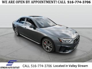 Comments Recent Arrival! 2022 Audi S4 3.0T Premium Plus quattro Daytona Gray Pearl quattro 3.0L TFSI * NYS INSPECTION INCLUDED *, * FULL INTERIOR / EXTERIOR DETAIL *, * BACK UP CAMERA *, * NAVIGATION SYSTEM *, * BLUETOOTH *, * LIMITED NYS LEMON LAW WARRANTY INCLUDED *, *FRESH OIL CHANGE *, * 150 MULTI POINT INSPECTION *, 2 Rear USB Charging Ports, Adaptive Cruise Control w/Traffic Jam Assist, Alarm System w/Motion Sensors, Audi Active Lane Assist, Audi Advanced Key, Audi Connect PRIME & PLUS Online Services, Audi Phone Box, Audi Side Assist w/Pre Sense Rear, Audi Virtual Cockpit Plus, Auto-Dimming Exterior Mirrors w/Memory, Black Exterior Mirror Housings, Black Exterior Trim, Black Optic Package, Body Color Side Sill Blades, Convenience Package, Driver's Seat Memory, Hands-On Detection Steering Wheel, Heated Steering Wheel, Leatherette Covered Center Console & Door Armrests, MMI Navigation Plus, Navigation Package, Parking System Plus (Front/Rear Acoustic Sensors), Power Folding Exterior Mirrors, Premium Plus Package, Red Brake Calipers, S Sport Package, SiriusXM All Access Service, Sport Adaptive Damping Suspension, Sport Rear Differential, Top View Camera System, Wheels: 19" 5-V-Spoke-Star Design. BEGIN THE SIMPLE PROCESS. PERSONALIZE THE PAYMENTS THAT FIT YOUR BUDGET, ADD YOUR TRADE-IN INFORMATION, APPLY FOR YOUR AUTO LOAN, SCHEDULE A PICKUP OR DELIVERY DATE. (HOME DELIVERY AVAILABLE*). EVERY VEHICLE HAS BEEN PRICED BELOW COST IN ORDER TO TURN INVENTORY QUICKLY AND PASS ON THE SAVINGS TO YOU! EACH VEHICLE COMES WITH A FREE LIMITED POWERTRAIN WARRANTY AND FREE CARFAX REPORT! WITH THESE SAVINGS THESE VEHICLES WONT LAST. CALL TO GET YOUR GREAT DEAL TODAY! (516) 774-3706. When it comes to offering an array of lending sources for used car buyers of varying credit levels, it's tough to top Stream Auto Outlet and our dedicated finance department. As an used car dealer for the people, we proudly specialize in sub-prime lending, so no matter your credit rating, we invite you to apply for auto loans today! No matter if you're looking to put your good credit to use or seeking bad credit financing for your next used car, you can rely on our auto loan professionals to tailor a financing package to your situation. Options Black Optic Package, Convenience Package, Navigation Package, Premium Plus Package, S Sport Package, 10 Speakers, AM/FM radio, Audi Connect PRIME & PLUS Online Services, Bang & Olufsen Sound System w/3D Sound, Radio data system, Radio: MMI w/Audi Sound System, SiriusXM All Access Service, Air Conditioning, Automatic temperature control, Front dual zone A/C, Rear air conditioning, Rear window defroster, Audi Advanced Key, Driver's Seat Memory, Power driver seat, Power steering, Power windows, Remote keyless entry, Steering wheel mounted audio controls, Four wheel independent suspension, Speed-sensing steering, Sport Rear Differential, Traction control, 4-Wheel Disc Brakes, ABS brakes, Dual front impact airbags, Dual front side impact airbags, Emergency communication system: Audi connect CARE, Front anti-roll bar, Knee airbag, Low tire pressure warning, Occupant sensing airbag, Overhead airbag, Rear anti-roll bar, Red Brake Calipers, Power moonroof, Brake assist, Electronic Stability Control, Exterior Parking Camera Rear, Auto High-beam Headlights, Delay-off headlights, Front fog lights, Alarm System w/Motion Sensors, Panic alarm, Adaptive Cruise Control w/Traffic Jam Assist, Hands-On Detection Steering Wheel, Speed control, Auto-Dimming Exterior Mirrors w/Memory, Black Audi Rings & Badges, Black Exterior Mirror Housings, Black Exterior Trim, Body Color Side Sill Blades, Bumpers: body-color, Heated door mirrors, Power door mirrors, Power Folding Exterior Mirrors, Spoiler, Sport Adaptive Damping Suspension, Turn signal indicator mirrors, 2 Rear USB Charging Ports, All-Weather Floor Mats, Audi Active Lane Assist, Audi Phone Box, Audi Phone Box Delete, Audi S Beam, Audi Side Assist w/Pre Sense Rear, Audi smartphone interface (Apple CarPlay/Android Auto), Audi Virtual Cockpit Plus, Auto-dimming Rear-View mirror, Cargo Mat, Compass, Driver door bin, Driver vanity mirror, Front reading lights, Garage door transmitter: HomeLink, Heated Front S Sport Seats, Heated Steering Wheel, Illuminated entry, Integrated Toll Module Delete, Leather Shift Knob, Leather steering wheel, Leatherette Covered Center Console & Door Armrests, MMI Navigation Plus, Outside temperature display, Overhead console, Parking System Plus (Front/Rear Acoustic Sensors), Passenger vanity mirror, Rear reading lights, Rear seat center armrest, Sport steering wheel, Tachometer, Telescoping steering wheel, Tilt steering wheel, Top View Camera System, Trip computer, Front Bucket Seats, Front Center Armrest, Heated front seats, Leather/Dinamica Seating Surfaces, Power passenger seat, Split folding rear seat, Passenger door bin, Alloy wheels, Wheels: 18" 5-Y-Spoke Design, Wheels: 19" 5-V-Spoke-Star Design, Rain sensing wipers, Speed-Sensitive Wipers, Variably intermittent wipers, * NYS INSPECTION INCLUDED *, * FULL INTERIOR / EXTERIOR DETAIL *, * BACK UP CAMERA *, * NAVIGATION SYSTEM *, * BLUETOOTH *, * LIMITED NYS LEMON LAW WARRANTY INCLUDED *, *FRESH OIL CHANGE *, * 150 MULTI POINT INSPECTION *