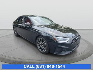 Comments 2023 Audi S4 3.0T Prestige quattro Black 8-Speed Automatic Clean CARFAX. 21/30 City/Highway MPG All pricing and details on this website are believed to be accurate, but we do not warrant or guarantee such accuracy. Please call or email us for complete vehicle-specific information. All displayed inventory is subject to prior sale, and all prices expire at midnight on the date displayed. Every reasonable effort has been made to ensure the accuracy of the information on this site; however, absolute accuracy cannot be guaranteed. Advertised specials exclude state tax, city tax, license, registration, NY state inspection, NYS tire recycling fee, finance charges, reconditioning fees and applicable dealer fees. All online prices are a balance after putting $3,995 down Please verify any information in question with a dealership sales manager, which can be done by calling us at (631) 646-1544 or visiting our dealership. Options 10 Speakers, AM/FM radio, Radio data system, Radio: MMI w/Audi Sound System, Air Conditioning, Automatic temperature control, Front dual zone A/C, Rear air conditioning, Rear window defroster, Power driver seat, Power steering, Power windows, Remote keyless entry, Steering wheel mounted audio controls, Four wheel independent suspension, Speed-sensing steering, Traction control, 4-Wheel Disc Brakes, ABS brakes, Dual front impact airbags, Dual front side impact airbags, Emergency communication system: Audi connect CARE, Front anti-roll bar, Knee airbag, Low tire pressure warning, Occupant sensing airbag, Overhead airbag, Rear anti-roll bar, Power moonroof, Brake assist, Electronic Stability Control, Exterior Parking Camera Rear, Auto High-beam Headlights, Delay-off headlights, Front fog lights, Panic alarm, Speed control, Bumpers: body-color, Heated door mirrors, Power door mirrors, Spoiler, Turn signal indicator mirrors, Audi smartphone interface (Apple CarPlay/Android Auto), Auto-dimming Rear-View mirror, Compass, Driver door bin, Driver vanity mirror, Front reading lights, Garage door transmitter: HomeLink, Heated Front S Sport Seats, Illuminated entry, Leather Shift Knob, Leather steering wheel, Outside temperature display, Overhead console, Passenger vanity mirror, Rear reading lights, Rear seat center armrest, Sport steering wheel, Tachometer, Telescoping steering wheel, Tilt steering wheel, Trip computer, Front Bucket Seats, Front Center Armrest, Heated front seats, Leather/Dinamica Seating Surfaces, Power passenger seat, Split folding rear seat, Passenger door bin, Alloy wheels, Wheels: 19" 5-Arm-Torsio Design, Rain sensing wipers, Speed-Sensitive Wipers, Variably intermittent wipers