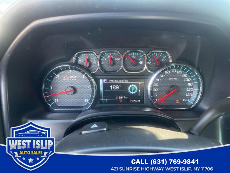 ABS, 4-Wheel Disc Brakes, 8 Cylinder Engine, A/C, A/T, Adjustable Steering Wheel, Security System, AM/FM Stereo, Auxiliary Audio Input, Back-Up Camera, CD Player, Climate Control, Cruise Control, Daytime Running Lights, Driver Air Bag, Driver Illuminated Vanity Mirror, Driver Adjustable Lumbar, Driver Vanity Mirror, Multi-Zone A/C, Auto-Dimming Rearview Mirror, Stability Control, Fog Lamps, Four Wheel Drive, Floor Mats, Tow Hooks, Conventional Spare Tire, Gasoline Fuel, Heated Front Seat(s), Heated Mirrors, Integrated Turn Signal Mirrors, Keyless Entry, Leather Seats, Leather Steering Wheel, Locking/Limited Slip Differential, Mirror Memory, MP3 Player, Navigation from Telematics, Telematics, Pass-Through Rear Seat, Passenger Air Bag, Passenger Air Bag Sensor, Passenger Illuminated Visor Mirror, Passenger Adjustable Lumbar, Passenger Vanity Mirror, Power Door Locks, Power Mirror(s), Power Driver Seat, Power Folding Mirrors, Power Passenger Seat, Power Steering, Power Windows, Privacy Glass, Rear Bench Seat, Rear Defrost, Rear Head Air Bag, Remote Engine Start, Requires Subscription, Satellite Radio, Seat Memory, Front Side Air Bag, Front Head Air Bag, Sliding Rear Window, Smart Device Integration, Steering Wheel Audio Controls, Tire Pressure Monitor, Traction Control, Tow Hitch, Universal Garage Door Opener, WiFi Hotspot, Bluetooth Connection, Bumper, front chrome, Bumper, rear chrome, CornerStep, rear bumper, Door handles, chrome, Fog lamps, front, halogen, Glass, deep-tinted, Grille, chrome with chrome surround with chrome horizontal bars with Argent mesh and Z71 emblem, Headlamps, halogen projector, Lamps, cargo area, cab mounted with switch on center switch bank, Mirror caps, chrome, Mirrors, outside chrome cap, heated power-adjustable, power-folding and driver-side auto-dimming with integrated turn signal indicators and puddle lamps (includes driver's side spotter mirror), Moldings, bodyside, chrome, Recovery hooks, front, frame-mounted, black, Tailgate and bed rail protection cap, top, Tailgate, EZ-Lift and Lower, Tailgate, locking utilizes same key as ignition and door, Tire carrier lock, keyed cylinder lock that utilizes same key as ignition and door, Tire, spare P265/70R17 all-season, blackwall, Tires, P265/65R18 all-terrain, blackwall, Wheel, full-size spare, 17" x 7" (43.2 cm x 17.8 cm) aluminum (Included and only available with model K15543 and (L83) 5.3L EcoTec3 V8 engine or (LV3) 4.3L EcoTec3 V6 engine.), Wheelhouse liners, rear, Wheels, 18" x 8.5" (45.7 cm x 21.6 cm) bright-machined aluminum, Air conditioning, dual-zone automatic climate control, Assist handle, front passenger on A-pillar, Cruise control, electronic with set and resume speed, steering wheel-mounted, Defogger, rear-window electric, Door locks, power, Driver Information Center, 4.2-inch diagonal color display includes driver personalization, warning messages and vehicle information, Driver Personalization Memory, Seat and Mirrors, Floor covering, color-keyed carpeting with rubberized vinyl floor mats (Double Cab and Crew Cabs include second row floor mats), Instrumentation, 6-gauge cluster featuring speedometer, fuel level, engine temperature, tachometer, voltage and oil pressure, Mirror, inside rearview auto-dimming, Power outlet, 110-volt AC, Remote Keyless Entry, with 2 transmitters, Remote vehicle starter system, Seat, rear 60/40 folding bench (folds up), 3-passenger (includes child seat top tether anchor), Seating, heated driver and front passenger, Seats, front 40/20/40 leather-appointed split-bench, 3-passenger with (KA1) heated seat cushions and seat backs includes 10-way power driver and front passenger seat adjusters, including driver/front passenger power recline, driver/front passenger power lumbar, 2-position driver memory and adjustable outboard head restraints., Steering column, manual tilt and telescoping, Steering wheel audio controls, Steering wheel, leather-wrapped with audio and cruise controls, Theft-deterrent system, unauthorized entry, Universal Home Remote, Visors, driver and front passenger illuminated vanity mirrors, Window, power, rear sliding with rear defogger, Windows, power front and rear with driver express up and down and express down on all other windows, Air cleaner, high-capacity, Alternator, 150 amps, Battery, heavy-duty 720 cold-cranking amps/80 Amp-hr, maintenance-free with rundown protection and retained accessory power, Body, Pick Up Box, Brakes, 4-wheel disc with DURALIFE rotors, 4-wheel antilock, Cooling, auxiliary external transmission oil cooler, Cooling, external engine oil cooler, Differential, heavy-duty locking rear, Engine, 5.3L EcoTec3 V8 with Active Fuel Management, Direct Injection and Variable Valve Timing includes aluminum block construction (355 hp [265 kW] @ 5600 rpm, 383 lb-ft of torque [518 Nm] @ 4100 rpm; more than 300 lb-ft of torque from 2000 to 5600 rpm), Exhaust, aluminized stainless-steel muffler and tailpipe, Four wheel drive, Frame, fully-boxed, hydroformed front section, GVWR, 7200 lbs. (3266 kg) (Requires 4WD models and (L83) 5.3L EcoTec3 V8 engine or (L86) 6.2L EcoTec3 V8 engine.), Rear axle, 3.08 ratio (Requires (L83) 5.3L EcoTec3 V8 engine. Not available with (RD2) 20" chrome wheels, (RD4) 20" polished-aluminum wheels or 22" LPO wheels.), Steering, Electric Power Steering (EPS) assist, rack-and-pinion, Transfer case, electronic Autotrac with rotary dial control (Included with 4WD models only.), Transmission, 6-speed automatic, electronically controlled with overdrive and tow/haul mode. Includes Cruise Grade Braking and Powertrain Grade Braking, Underbody shield, transfer case protection (Requires 4WD models.), Vehicle control, hill descent, Z71 Package, Off-Road includes monotube Rancho brand shocks, (K47) air cleaner, (JHD) Hill Descent Control, (NZZ) underbody shield on 4WD models and (V76) recovery hooks. Also includes brushed metal Z71 door sill plate, unique Z71 gauge cluster, unique finish interior trim plates, unique lower bumper a