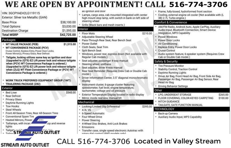 Preferred Equipment Group 1WT, Trailering Package, WT Convenience Package, WT Value Package, 6 Speakers, Radio data system, Radio: Chevrolet Infotainment 3 System, Air Conditioning, Electric Rear-Window Defogger, Bluetooth® For Phone, EZ Lift Power Lock & Release Tailgate, Power Rear Windows w/Express Down, Power steering, Power windows, Remote Keyless Entry, Heavy Duty Suspension, Manual Tilt-Wheel Steering Column, Speed-sensing steering, Traction control, 4-Wheel Disc Brakes, ABS brakes, Dual front impact airbags, Dual front side impact airbags, Front anti-roll bar, Front wheel independent suspension, Locking Tailgate, Low tire pressure warning, Occupant sensing airbag, Overhead airbag, Power Door Locks, Black (Semi-Gloss) Front Bumper, Black (Semi-Gloss) Rear Bumper, Brake assist, Electronic Stability Control, Exterior Parking Camera Rear, Delay-off headlights, Fully automatic headlights, Steering Wheel Mounted Electronic Cruise Control, Heavy-Duty Rear Locking Differential, 170 Amps Alternator, Black Grille, Black Manual Outside Mirrors, Chevytec Spray-On Black Bedliner, Heated Power-Adjustable Outside Mirrors, Hitch Guidance, Rear step bumper, 3.5" Diagonal Monochromatic Display, All-Weather Floor Liner (LPO), Apple CarPlay/Android Auto, Color-Keyed Carpeting Floor Covering, Driver door bin, Front reading lights, Front Rubberized Vinyl Floor Mats, Outside temperature display, Overhead console, Passenger vanity mirror, Rear reading lights, Rear Rubberized-Vinyl Floor Mats, Rubberized-Vinyl Floor Covering, Tachometer, Tilt steering wheel, Trip computer, Underseat Storage (LPO), Voltmeter, Front 40/20/40 Split-Bench Seat, Front Center Armrest, Rear 60/40 Folding Bench Seat (Folds Up), Split folding rear seat, Vinyl Seat Trim, Passenger door bin, Front Frame-Mounted Black Recovery Hooks, Wheels: 17" x 8" Ultra Silver Painted Steel, Deep-Tinted Glass, Solar Absorbing Tinted Glass, Variably intermittent wipers, 3.42 Rear Axle Ratio, * NYS INSPECTION INCLUDED *, * FULL INTERIOR / EXTERIOR DETAIL *, * BLUETOOTH *, * LIMITED NYS LEMON LAW WARRANTY INCLUDED *, *FRESH OIL CHANGE *, * 150 MULTI POINT INSPECTION *