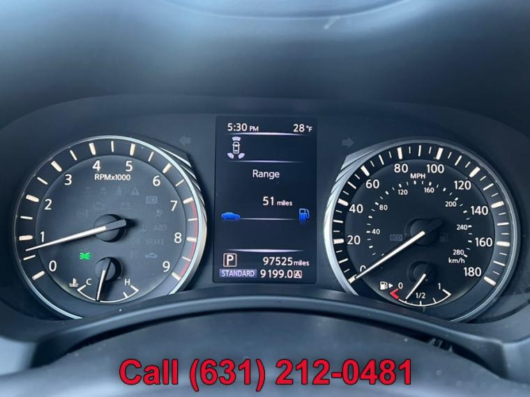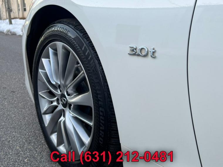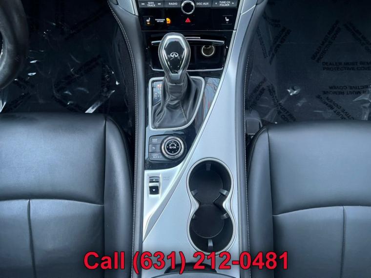 ABS, 4-Wheel Disc Brakes, 7-Speed A/T, A/C, A/T, Adjustable Steering Wheel, Security System, All Wheel Drive, Aluminum Wheels, AM/FM Stereo, Transmission w/Dual Shift Mode, Automatic Headlights, Auxiliary Audio Input, Back-Up Camera, Brake Assist, Bucket Seats, CD Player, Child Safety Locks, Climate Control, Cruise Control, Daytime Running Lights, Driver Air Bag, Driver Illuminated Vanity Mirror, Driver Adjustable Lumbar, Driver Vanity Mirror, Multi-Zone A/C, Auto-Dimming Rearview Mirror, Stability Control, Fog Lamps, Floor Mats, Gasoline Fuel, HD Radio, Heated Mirrors, Integrated Turn Signal Mirrors, Intermittent Wipers, Keyless Entry, Keyless Start, Leather Steering Wheel, MP3 Player, Pass-Through Rear Seat, Passenger Air Bag, Passenger Air Bag Sensor, Passenger Illuminated Visor Mirror, Passenger Vanity Mirror, Power Door Locks, Power Mirror(s), Power Driver Seat, Power Passenger Seat, Power Steering, Sun/Moonroof, Power Windows, Premium Synthetic Seats, Rain Sensing Wipers, Rear Bench Seat, Rear Defrost, Rear Head Air Bag, Remote Trunk Release, Requires Subscription, Satellite Radio, Front Side Air Bag, Front Head Air Bag, Smart Device Integration, Steering Wheel Audio Controls, Generic Sun/Moonroof, Tire Pressure Monitor, Tires - Front Performance, Tires - Rear Performance, Traction Control, Trip Computer, Turbocharged, Universal Garage Door Opener, V6 Cylinder Engine, Variable Speed Intermittent Wipers, Engine Immobilizer, Bluetooth Connection, Body-Colored Front Bumper w/Chrome Rub Strip/Fascia Accent, Body-Colored Power Heated Side Mirrors w/Manual Folding and Turn Signal Indicator, Body-Colored Rear Bumper w/Chrome Rub Strip/Fascia Accent, Chrome Door Handles, Chrome Grille, Chrome Side Windows Trim and Black Front Windshield Trim, Clearcoat Paint, Express Open/Close Sliding And Tilting Glass 1st Row Sunroof w/Sunshade, Fixed Rear Window w/Defroster, Front Fog Lamps, Fully Automatic Projector Beam Led Low/High Beam Daytime Running Headlamps w/Delay-Off, Galvanized Steel/Aluminum Panels, LED Brakelights, Light Tinted Glass, Perimeter/Approach Lights, Speed Sensitive Rain Detecting Variable Intermittent Wipers, Tires: P225/50R18 AS Run-Flat, Trunk Rear Cargo Access, Wheels: 18" x 7.5" Aluminum-Alloy, 2 12V DC Power Outlets, 2 Seatback Storage Pockets, Air Filtration, Analog Display, Bench Front Facing Rear Seat, Cargo Space Lights, Carpet Floor Trim and Carpet Trunk Lid/Rear Cargo Door Trim, Compass, Cruise Control w/Steering Wheel Controls, Day-Night Auto-Dimming Rearview Mirror, Delayed Accessory Power, Driver And Passenger Door Bins, Driver And Passenger Visor Vanity Mirrors w/Driver And Passenger Illumination, Driver And Passenger Auxiliary Mirror, Driver Foot Rest, Driver Seat, Dual Zone Front Automatic Air Conditioning, Engine Immobilizer, Fade-To-Off Interior Lighting, FOB Controls -inc: Cargo Access and Windows, Front And Rear Map Lights, Front Bucket Seats -inc: 8-way power driver w/2-way manual lumbar and 8-way power passenger, Front Center Armrest and Rear Center Armrest w/Pass-Thru, Front Cupholder, Full Carpet Floor Covering -inc: Carpet Front And Rear Floor Mats, Full Cloth Headliner, Full Floor Console w/Covered Storage, Mini Overhead Console w/Storage and 2 12V DC Power Outlets, Gauges -inc: Speedometer, Odometer, Engine Coolant Temp, Tachometer, Trip Odometer and Trip Computer, HomeLink Garage Door Transmitter, HVAC -inc: Underseat Ducts and Console Ducts, Illuminated Locking Glove Box, Interior Trim -inc: Aluminum Instrument Panel Insert, Aluminum Door Panel Insert, Aluminum Console Insert and Chrome Interior Accents, Leather Steering Wheel, Leather/Aluminum Gear Shifter Material, Leatherette Door Trim Insert, Leatherette Seating Surfaces, Manual Anti-Whiplash Adjustable Front Head Restraints and Manual Adjustable Rear Head Restraints, Manual Tilt/Telescoping Steering Column, Outside Temp Gauge, Passenger Seat, Perimeter Alarm, Power 1st Row Windows w/Front And Rear 1-Touch Up/Down, Power Door Locks w/Autolock Feature, Power Fuel Flap Locking Type, Power Rear Windows, Proximity Key For Doors And Push Button Start, Rear Cupholder, Remote Keyless Entry w/Integrated Key Transmitter, 2 Door Curb/Courtesy, Illuminated Entry, Illuminated Ignition Switch and Panic Button, Remote Releases -Inc: Power Cargo Access and Power Fuel, Seats w/Leatherette Back Material, Smart Device Integration, Trip Computer, Valet Function, 150 Amp Alternator, 2.94 Axle Ratio, 20 Gal. Fuel Tank, 4-Wheel Disc Brakes w/4-Wheel ABS, Front And Rear Vented Discs, Brake Assist and Hill Hold Control, 62-Amp/Hr Maintenance-Free Battery w/Run Down Protection, Double Wishbone Front Suspension w/Coil Springs, Dual Stainless Steel Exhaust w/Chrome Tailpipe Finisher, Electric Power-Assist Speed-Sensing Steering, Engine: 3.0L V6 Twin Turbo DOHC, Front And Rear Anti-Roll Bars, Full-Time All-Wheel, Gas-Pressurized Shock Absorbers, Multi-Link Rear Suspension w/Coil Springs, Transmission w/Driver Selectable Mode and Sequential Shift Control, Transmission: 7-Speed Automatic w/Overdrive -inc: manual shift mode w/downshift rev matching and INFINITI drive mode selector, ABS And Driveline Traction Control, Airbag Occupancy Sensor, Curtain 1st And 2nd Row Airbags, Dual Stage Driver And Passenger Front Airbags, Dual Stage Driver And Passenger Seat-Mounted Side Airbags, Electronic Stability Control (ESC), Outboard Front Lap And Shoulder Safety Belts -inc: Rear Center 3 Point, Height Adjusters and Pretensioners, Predictive Forward Collision Warning w/FEB, Rear Child Safety Locks, RearView Monitor Back-Up Camera, Side Impact Beams, Tire Specific Low Tire Pressure Warning