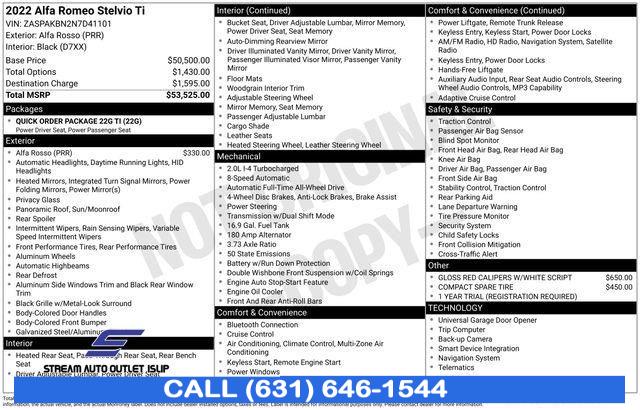 For more information on this 2022 Alfa Romeo Stelvio, please call Stream Auto Outlet Islip at (631) 646-1544 or with the contact form on this page. This vehicle's vin number is ZASPAKBN2N7D41101 and is recorded as being in stock at Stream Auto Outlet Islip at 2232 Sunrise Hwy in Islip. See all cars from this dealership.