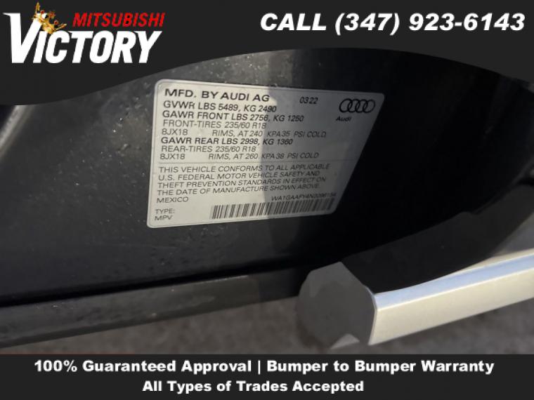 2022 Audi Q5 45 S line Premium quattro Gray 4D Sport Utility Save yourself Time and Money - Fill out a credit application online at victorymitsubishi.com and get pre-APPROVED! Financing available for all types of credit with low monthly payment that will fit you budget. Down Payment low as $599. Same day delivery. View our entire inventory by visiting our virtual showroom at victorymitsubishi.com - Only 2 blocks away from Exit 13 off I-95 or Minutes from exit 7 on the Hutchinson Parkway. While we make every effort to ensure the data listed here is correct, there may be instances where the pricing, options or vehicle features may be listed incorrectly. Dealer cannot be held liable for data that is listed incorrectly. to see more pictures of this vehicle or call us at (347) 923-6143 today to schedule your test drive. please refer to dealer’s website for exact pricing and for any incentives that we may apply! Our address is 4070 Boston Road, Bronx, NY 10475.
