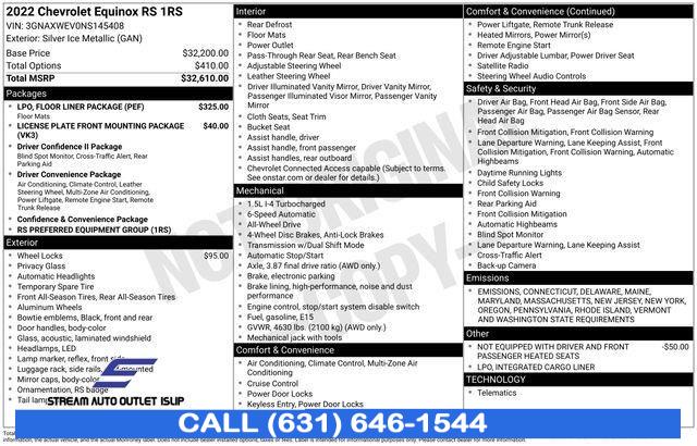 For more information on this 2022 Chevrolet Equinox, please call Stream Auto Outlet Islip at (631) 646-1544 or with the contact form on this page. This vehicle's vin number is 3GNAXWEV0NS145408 and is recorded as being in stock at Stream Auto Outlet Islip at 2232 Sunrise Hwy in Islip. See all cars from this dealership.